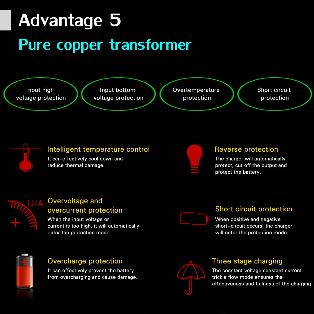 ЖК-дисплей с цифровым дисплеем напряжения, тока, температуры, заряда аккумулятора в режиме реального времени, легко читаемый. Интеллектуальная настройка тока и напряжения и автоматическая остановка входного тока после полной зарядки. Трехфазная зарядка: Зарядка постоянным током, зарядка постоянным напряжением, плавающая зарядка. Трансформатор из чистой меди, стабильная выходная мощность, высокая скорость конверсии, энергосбережение, большая емкость и т. д. Защита от перезаряда, защита от короткого замыкания, защита от обратного подключения. Корпус изготовлен из огнестойкого материала ABS, изолирован, огнестойкий и устойчив к высоким температурам. Подходит для 12В, 4ач до 20ач, свинцово-кислотных или AGM или гелевых аккумуляторов. Общего назначения, подходит для большинства автомобильных и мотоциклетных аккумуляторов, свинцово-кислотных, agm, gel, vrla.