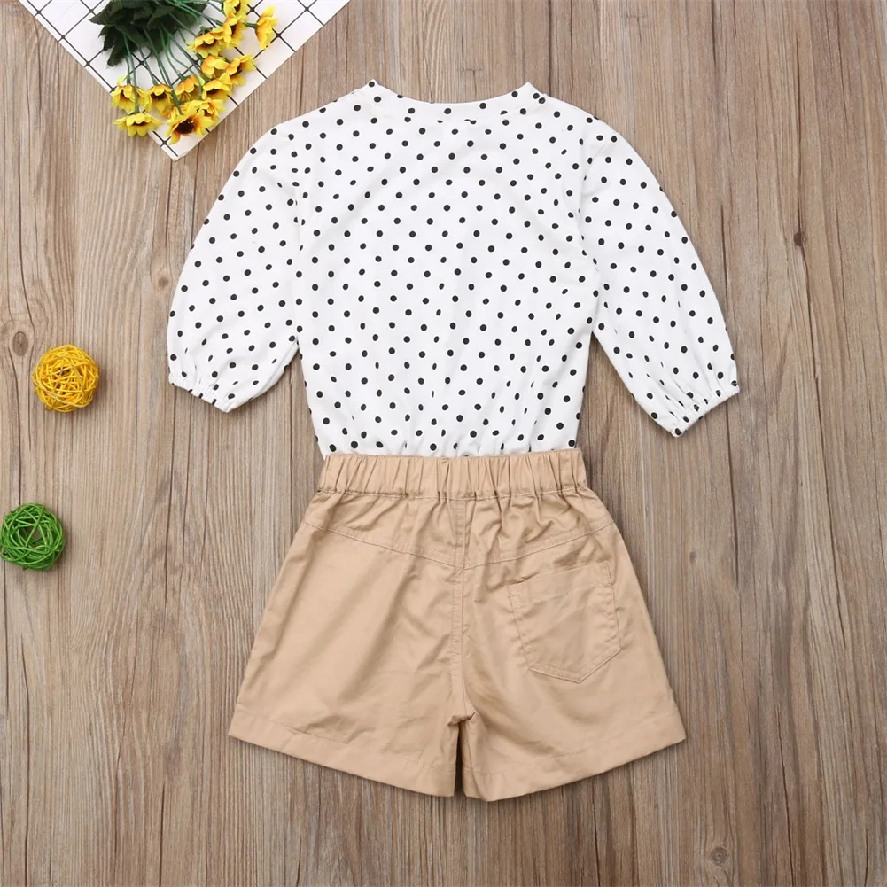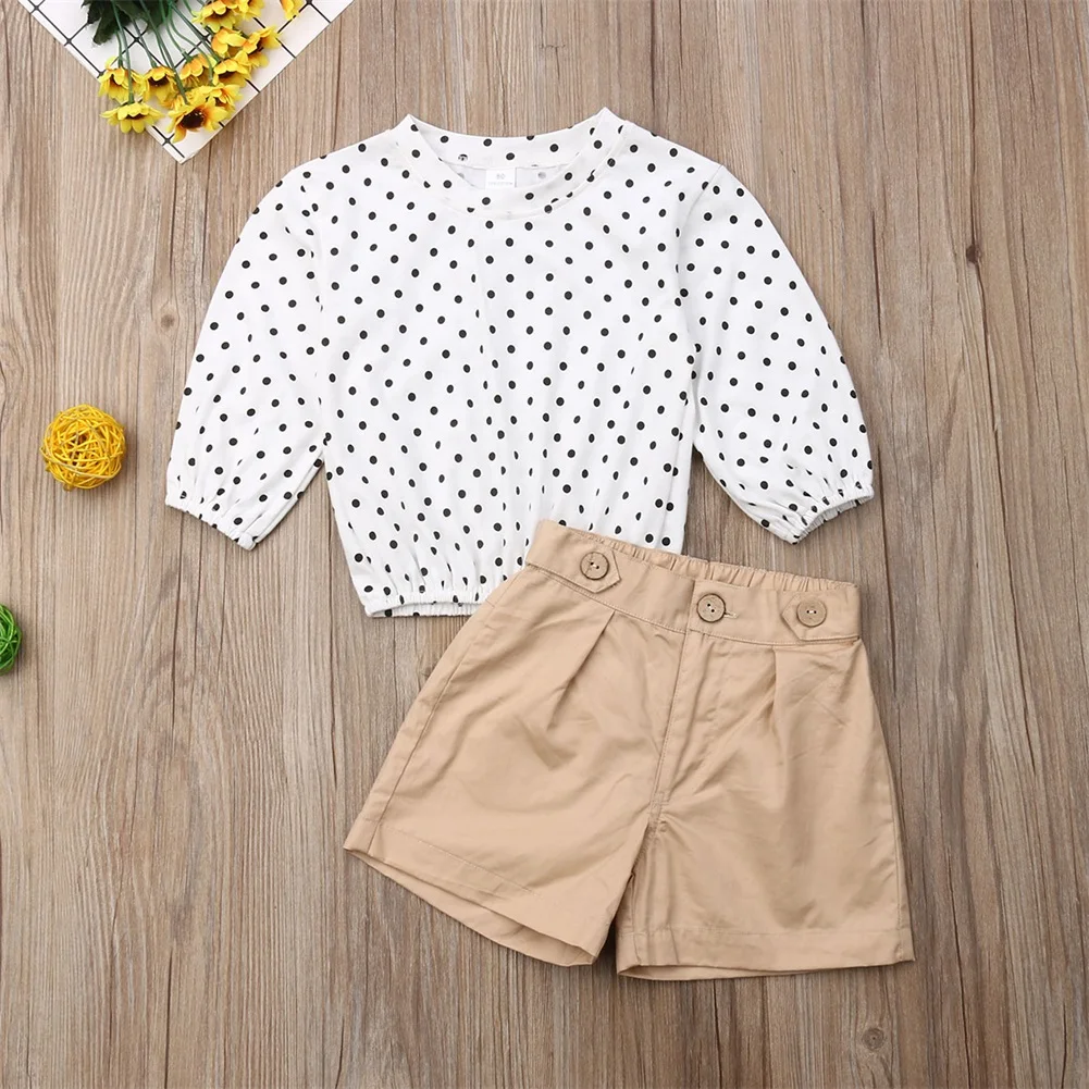 Новинка; Модный комплект из 2 предметов для маленьких девочек; Блузка в горошек; Футболка; Топ + шорты; Штаны!