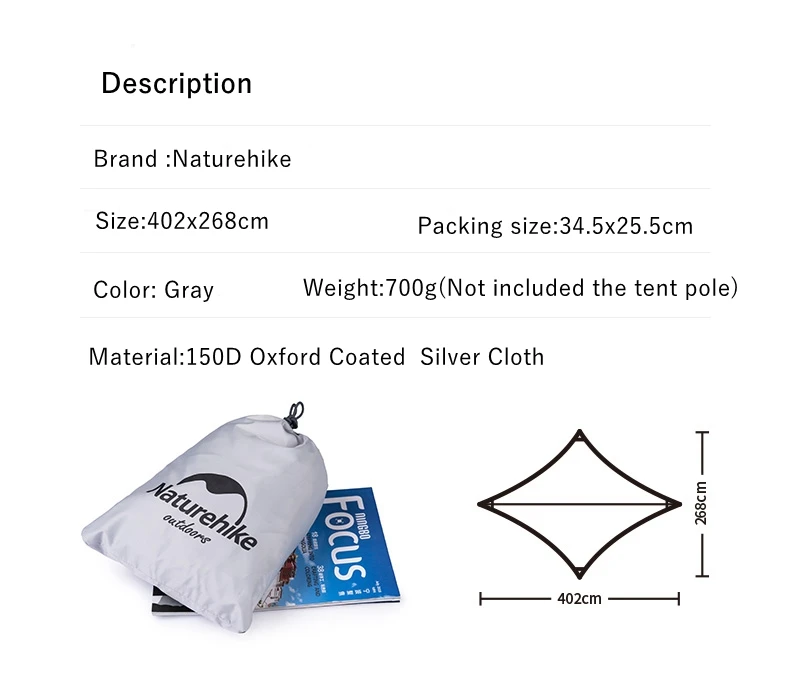 Бренд: Naturehike Название: облачный солнцезащитный козырек с серебряным покрытием Размер: 402*268 см Размер упаковки: 34,5*25,5 см Цвет: серый Материал: 150D ткань с покрытием Оксфорд Вес: 700 г