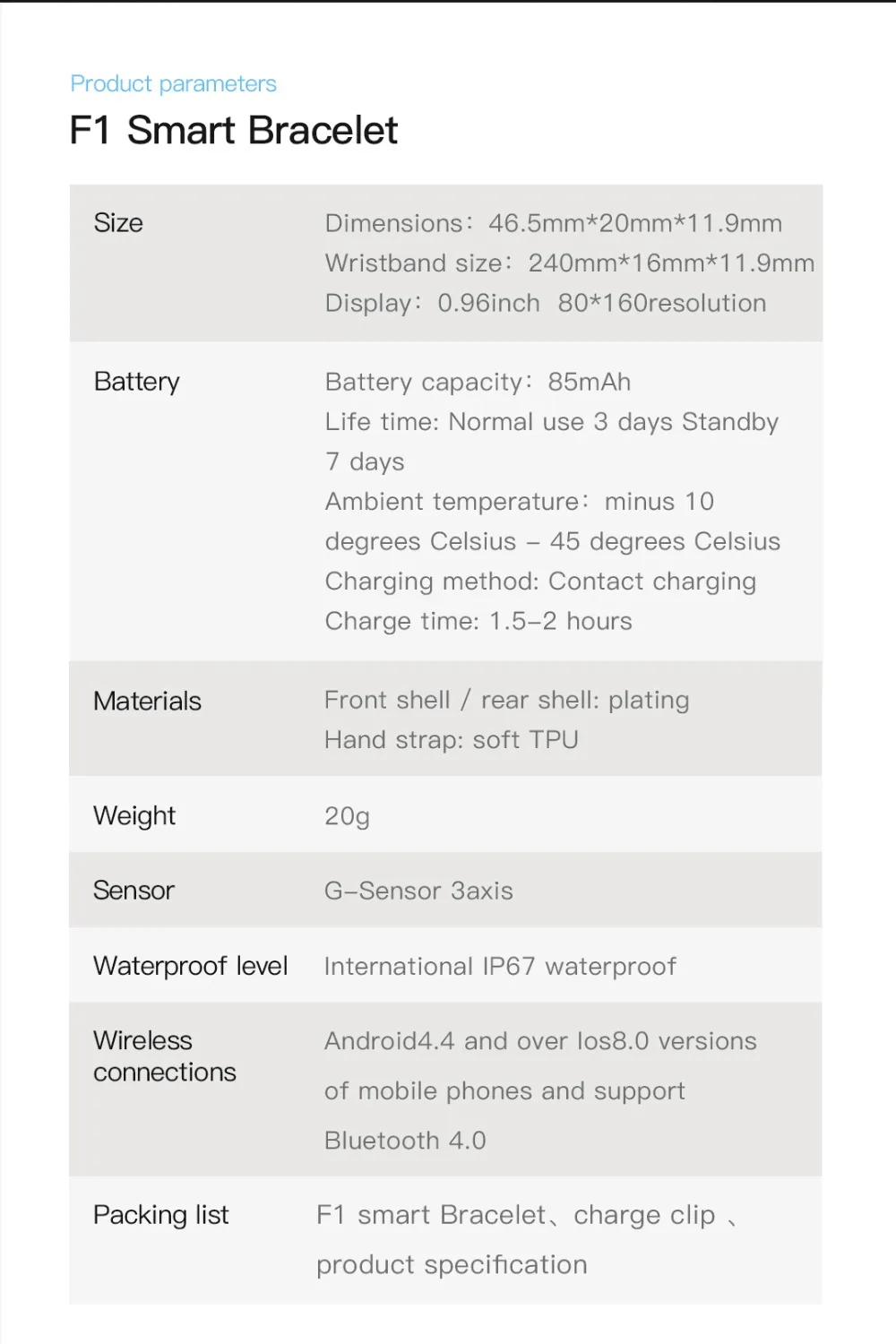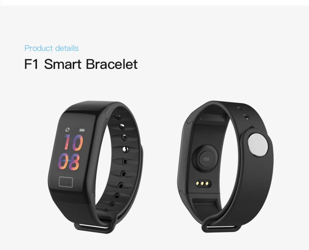 F1 Смарт-часы IP68 Водонепроницаемый фитнес-трекер монитор сердечного ритма кровяное давление женские мужские часы Смарт-часы F1 для Android IOS Особенности F1 Plus smart bracelet-это универсальный Смарт-браслет с пульсом и монитором артериального давления. Этот браслет не только заботится о вашем здоровье с помощью социальных контактов (напоминаем о звонках и сообщениях), но и содержит монитор сердечного ритма и артериального давления. -Монитор кислорода в крови и давления Товар предлагает передовые технологии для измерения насыщенности оксигемоглобина и давления вашей крови, сообщая о вашем физическом состоянии во все времена и в местах. -Монитор сердечного ритма 24-часовой непрерывный пульсометр автоматически отслеживает состояние своего тела, а также синхронизировать к подключенному мобильный телефон. -Функция напоминания о необходимости двигательной активности Браслет напомнит вам, сидите ли вы слишком долго и настоятельно рекомендуем вам заниматься спортом. -Монитор наблюдения за сном Отслеживайте время сна, качество сна, глубину сна и, наконец, нарисуйте свой рисунок сна, чтобы настроить привычку сна. -Комплексный спортивный трекер Несколько режимов записи позволяют часам отслеживать ваши пробежки и фиксировать расстояние, время, калории, а также максимальный и средний темп, скорость. -Несколько функций: календарь, секундомер, будильник удобны в различных видах деятельности. Примечание: Не помещайте часы в горячую воду, часы водонепроницаемые только в холодную воду. Основные параметры: -MCU: NRF52832 QFAC -Датчик ускорения: 3D ускоренный ROHMS KXTJ-1009-2 -Размер экрана: 0,96 дюйма -Интерактивный режим: одно касание -Bluetooth: Bluetooth LE 4,0 -Аккумулятор: 90 мАч -Время работы в режиме ожидания: 3 - 7 дней -Поддержка уведомлений: WeChat, QQ, Facebook, Twitter, WhatsApp, Skype, Instagram etc.03 Посылка 1 * умный Браслет 1 * USB Зарядное устройство 1 * Руководство пользователя