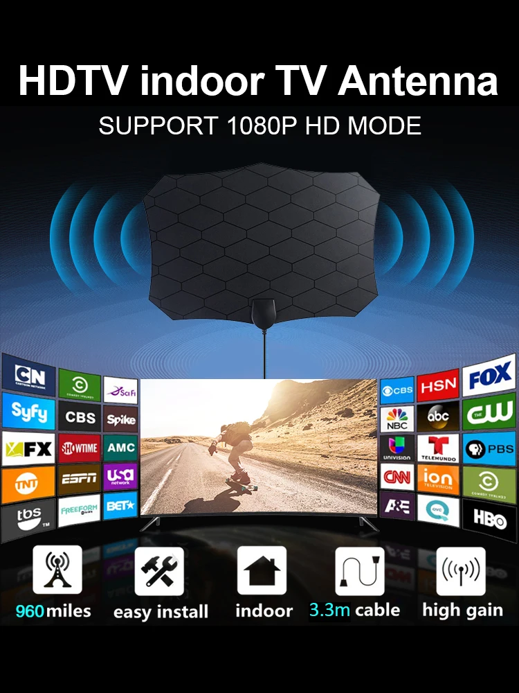 Новейшая 4K 25DB с высоким коэффициентом усиления HD TV DTV коробка цифров ТВ антенны EU Plug 960 миль усилитель активная комнатная антенна HD плоский дизайн DVB-T2 Описание: Супер тонкая внутренняя HD ТВ антенна: Наша Супер тонкая антенна специально разработана для приема цифровых ТВ-передач по воздуху (OTA) со всех ваших местных телевизионных станций. Так что никогда не платите очень дорогие кабельные или спутниковые сборы снова и получите все ваши местные каналы кристально чистого качества, абсолютно бесплатно. Характеристики внутренней HDTV антенны: 1) отличный прием на всех FM/VHF/каналы UHF. 2) может быть безопасно окрашен, чтобы соответствовать любому домашнему украшению, не влияя на прием или в результате потери сигнала. 3) супер мягкий, ненавязчивый тонкий дизайн и мощные возможности приема делают эту антенну лучшим выбором для любого дома. Характеристики внутренней телевизионной антенны: Частотный диапазон: 47-230 МГц, 470-862mhzreceing диапазон: FM/VHF/UHFGain: 28dBOutput уровень: 100 dbμmpedance: 75 figure Уровень шума: ≤ 3 дБ 4. Антенный кабель Длина: 3,3 м Руководство по настройке Шаг 1: Подключите конец прикрепленного коаксиального кабеля к разъему ANT/IN на задней части ТВ или цифровой преобразователь, Подключите вилку USV к usb-порту телевизора или цифрового конвертера. Шаг 2: Держите антенну в руке, рядом с окном, поместите ее горизонтально или вертикально. Шаг 3: в меню настройки телевизора или STB установите режим тюнера на «антенну» или «воздух» для получения более подробной инструкции, пожалуйста, обратитесь к Руководству по телевизору. Шаг 4: в меню настройки телевизора или STB Установите телевизор для «сканирования» каналов. Иногда это может быть указано как автоматическая программа, автоматическое сканирование, поиск каналов или сканирование каналов. Проконсультируйтесь с руководством по телевизору или детальными инструкциями. Шаг 5: если прием является спорадическим, попробуйте перемещать антенну в другое место и повторно использовать телевизор до тех пор, пока не будет найдено оптимальное положение. Шаг 6: Закрепите антенну в оптимальном положении. Особенности: 1. Бесплатные Каналы Full HD: Высококачественная антенна нового поколения может избавиться от высоких сборов за просмотр цифрового телевизора. Эта Антенна совместима с телевизионными конвертерами и сотнями цифровых телевизоров/4K ultra high definition (4K UHD), такими как ABC, CBS, NBC, PBC, Fox. Включая Местные новости, Детские и спортивные, прогноз погоды, мультфильмы и образовательные программы и т. Д. Простой и бесплатный инструмент для жизни, чтобы получить канал без ежемесячного счета. 2. Простота в использовании: ТВ Антенный светильник в виде пера, позволяет разместить его практически в любом месте и не требует питания. С уникальным пластиковым корпусом и серебряной суспензией, импортированной из США, все аксессуары являются чистой медью, чтобы обеспечить контакт свободным. Цифровая HD телевизионная антенна с 16.5ft коаксиальный кабель, усилитель, усилитель сигнала, запасные с клеящим веществом 3м. Установка-это ветерок всего с 3 шагами: Распакуйте, подключите его и отсканируйте каналы. Вы можете разместить его высоко на окне (настоятельно рекомендуется). 3. Модернизированный усилитель и Дальний радиус действия 960 миль: прием этой HDTV антенна оптимизирована в наиболее разумном состоянии, включая съемный усилитель для улавливания