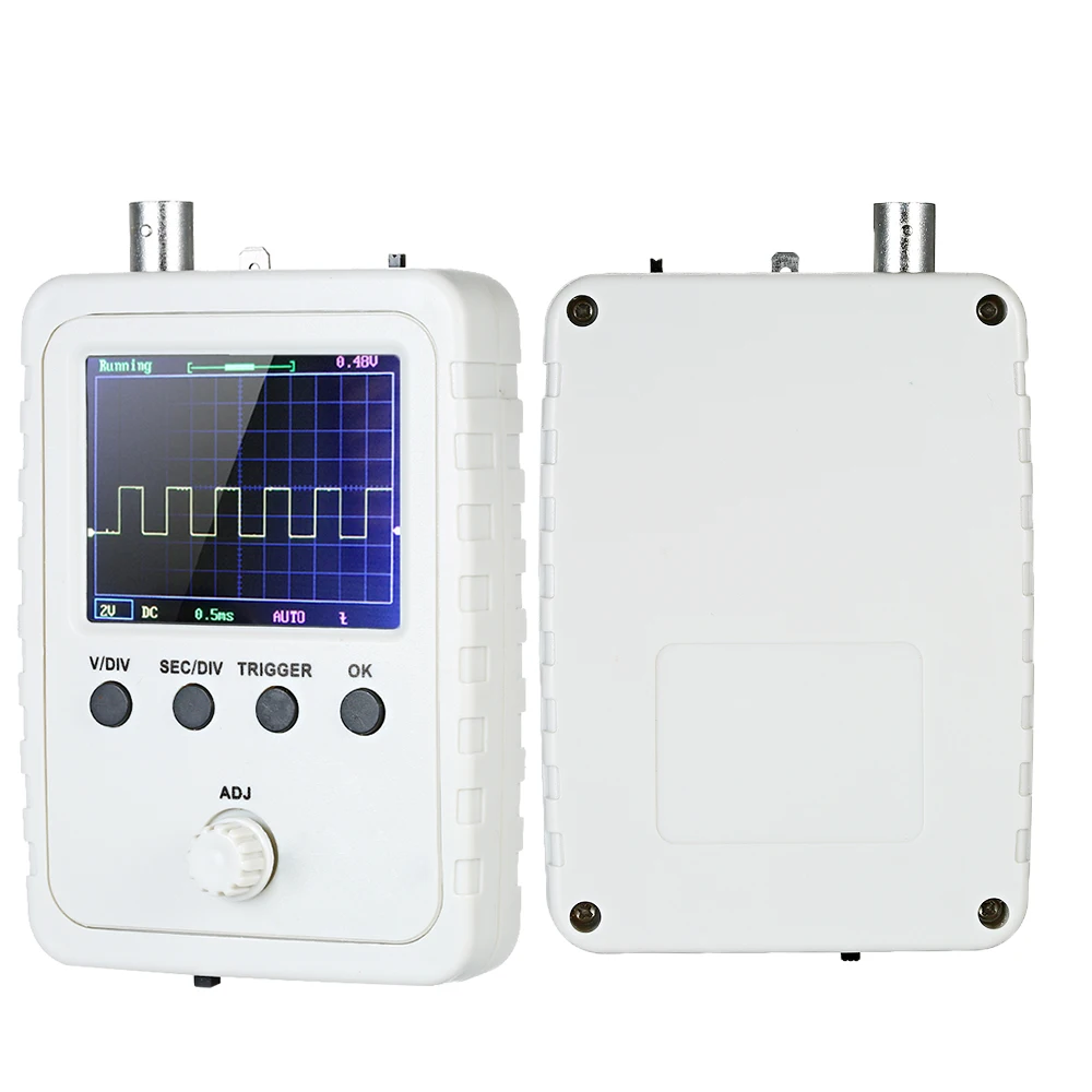 Этот цифровой осциллограф имеет такую же пропускную способность, как DSO138, но содержит значительные улучшения в конструкции, механизм и работе. Он оснащен интерактивный сенсорный экран, легкий и портативный размер, 2,4 дюймовый TFT экран и защитный чехол. Он может отображать параметры формы сигнала, такие как частота, период, ширина импульса, коэффициент нагрузки, Макс./мин./AVG./пиковая-пиковая/Виртуальная значения.