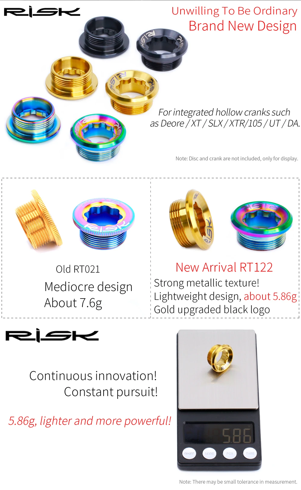 Совершенно новый дизайн Для встроенных полых кривошипов Как Deore/XT/SLX/XTR/105/UT/DA. Примечание: диск и Кривошип не входят в комплект, только для дисплея. Старый RT021 Посредственный дизайн Около 7,6 г Новое поступление RT122 Прочная металлическая текстура! Легкий дизайн, около 5,86 г Обновленный золотой черный логотип Непрерывные инновации! Постоянное стремление! 5,86 г, легче и мощнее!
