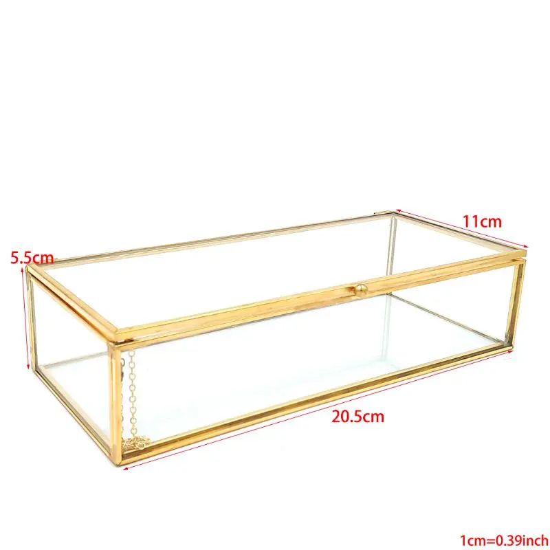 Настольная витрина с прозрачными стеклянными панелями и прочной латунной металлической рамкой.
