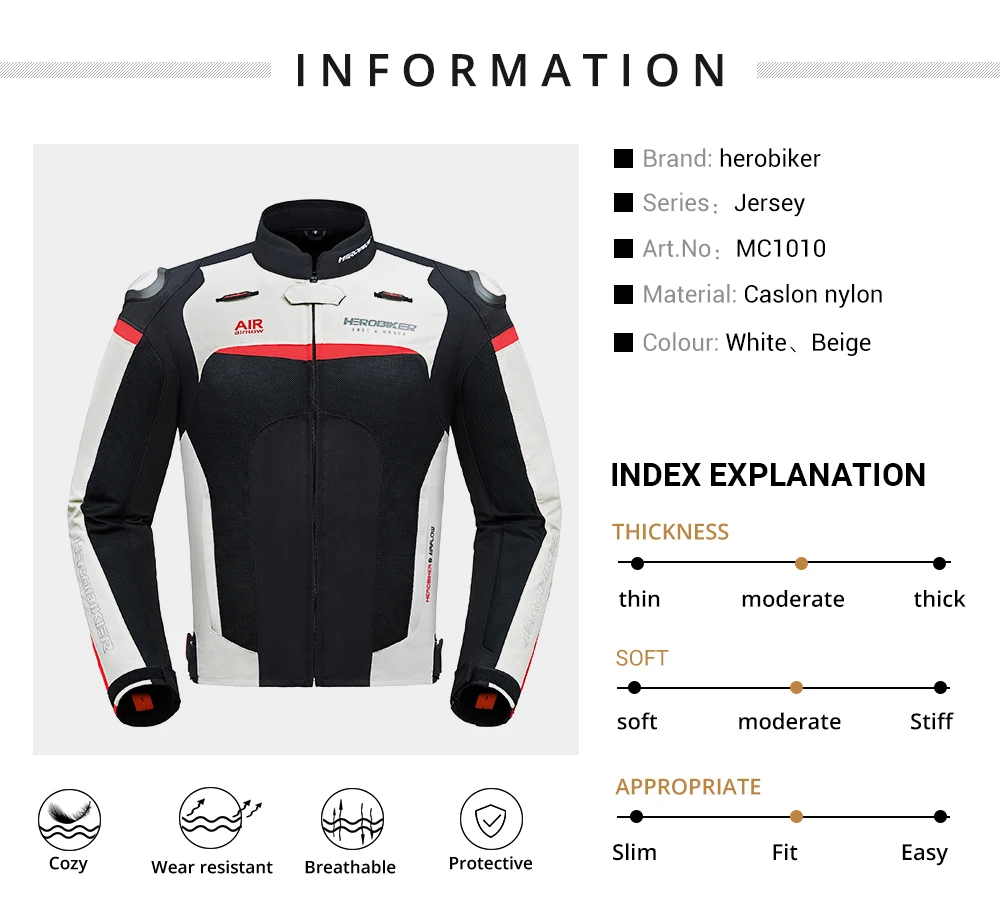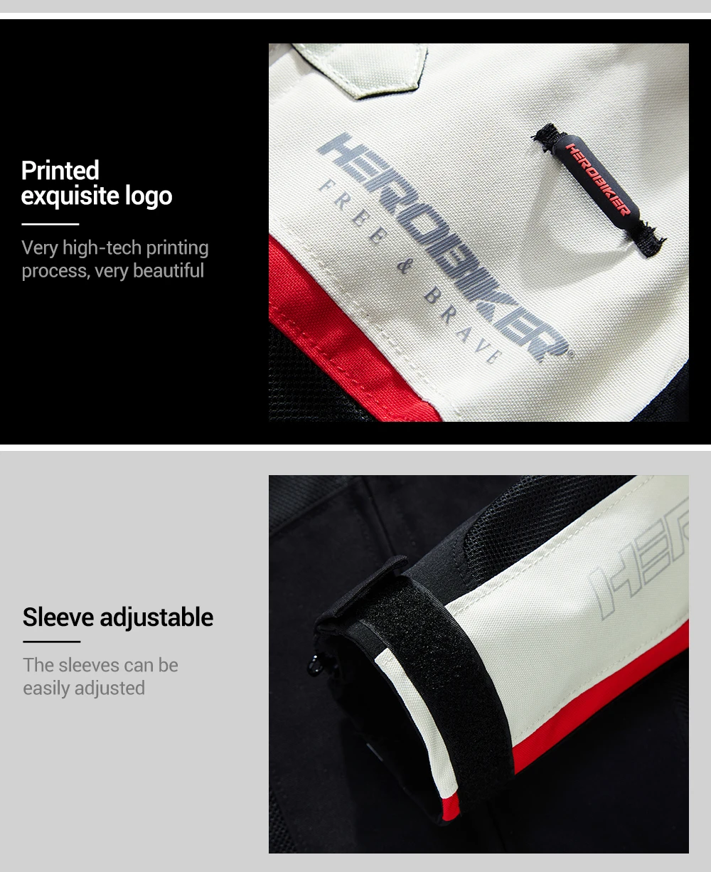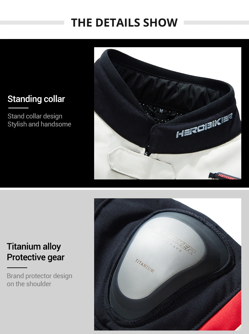 Ткань использует высокопрочный антифрикционный нейлон 500D Taslan и дышащую сетку Используйте молнию всемирно известного бренда SBS, чтобы продлить срок службы куртки. куртка Светоотражающие логотипы используются спереди и сзади для повышения безопасности езды Содержит нейлоновое белье, устойчивое к давлению воды 3000 Блок защиты из титана на плече Включает 5 защитных средств, сертифицированных CE И с функцией подключения шейного упора (в Нашем магазине ищите HEROBIKER Neck guard) В коплект входит: 1 х мотоциклетная куртка для гонок 5 съемных протекторовнезамедлительный: