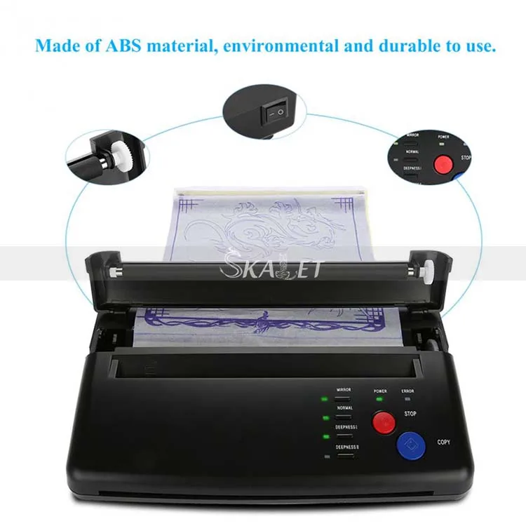 Изготовлен из материала ABS, который является экологичным, безопасным и прочным для долгосрочного использования. Подходит для печати переводной печатной бумаги с татуировками и термобумаги, а подходящий размер бумаги-A4 и B5, что обеспечивает быструю скорость печати, немного шумит. Два светильник показателей мощности светильник показывает в тех случаях, когда машина начнет работать, могут возникать расхождения на светильник показывает, что-то не так на машине, как, например, т/ч составляет от перегрева. Есть несколько кнопок/клавиш для различных функций, вы можете выбрать методы копирования, глубину и т. д., что очень удобно и функционально. Этот копир создан специально для тату-художника. Легкий, простой, надежный копир, который сделает вашу жизнь проще.