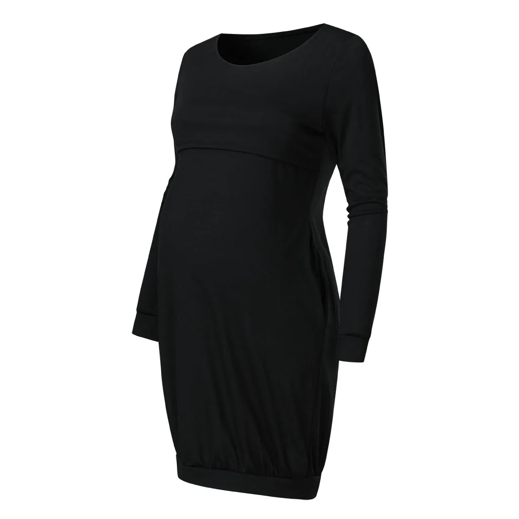 Женское однотонное платье для беременных с длинным рукавом и карманом на осень и зиму