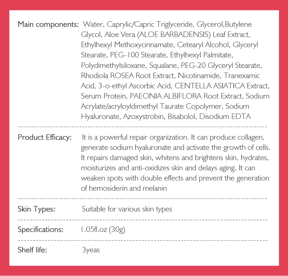 Основные компоненты: вода, каприловый/каприный глицерин алоэ вера бутилгликоль (алоэ барбинсис) экстракт листьев. Цетеариловый спирт полидиметилсилоксан глицерилстеарат PEG-I00 этилгексил стеарат этилгексилпальмитат глицерил стеарат Пег-20 Мягкий гель с жиром экстракт родиолы корень родиолы розовой никотинамид Транексамовая кислота аскорбиновая кислота натрия Альфа экстракт Alfa-3-O-Aliphate экстракт натрия/acryloyldimethyl Таурат гиалуронат натрия фунгисид спектра Azoxystrobin обширный бисаболол динатриевая соль этилендиаминтетрауксусной кислоты сополимер Эффективность продукта: это мощный ремонт Организации. Он может производить коллаген. Генерирует гиалуронат натрия и активирует рост клеток, который увлажняет и осветляет кожу увлажняет и восстанавливает поврежденную антикоррозийную кожу и замедляет старение. Это может привести к ослаблению пятен с двойным эффектом и предотвратить генерацию гемозидерина и меланина. Тип кожи: подходит для различных типов кожи. Технические характеристики: I.05f1oz (30 г) Срок годности: 3 года