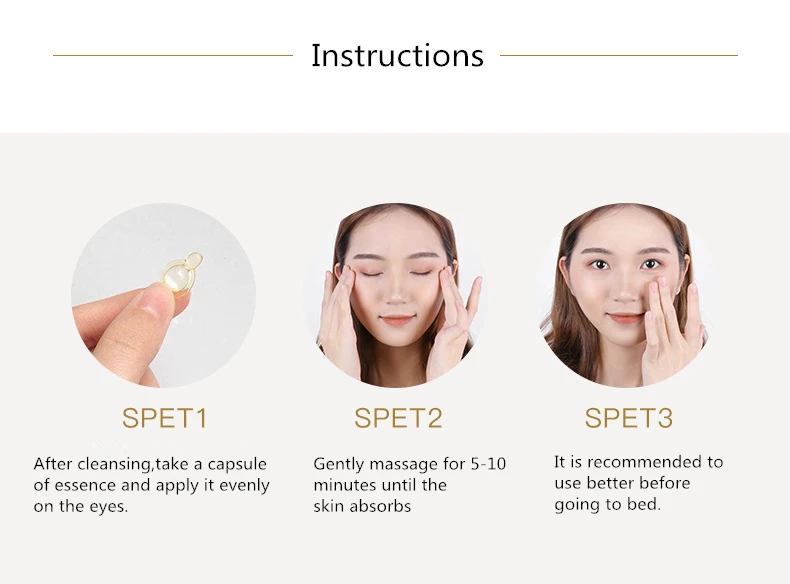 1. Капсулы сыворотки для глаз специально разработаны для кожи глаз, чтобы эффективно уменьшить темные круги, сухие глаза, гусиные лапки и другие проблемы с глазами. 2. Эффективно улучшает тонкие линии вокруг глаз, распущенную кожу вокруг глаз, темные круги, сухость глаз. 3. Пополняйте питательные вещества, необходимые для кожи вокруг глаз и Повышайте барьер самозащиты кожи вокруг глаз. 4. Точный уход, точное квантирование каждой гранулы, для удовлетворения потребностей кожи глаз, не отходов. 5. Растительная Капсульная упаковка, биоразлагаемая, чистая и Гигиеничная. 6. Дизайн капсулы не может быть сбит, посыпан, легко носить с собой.