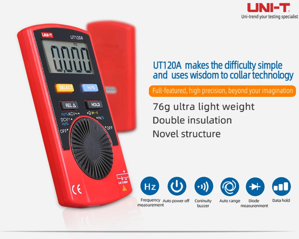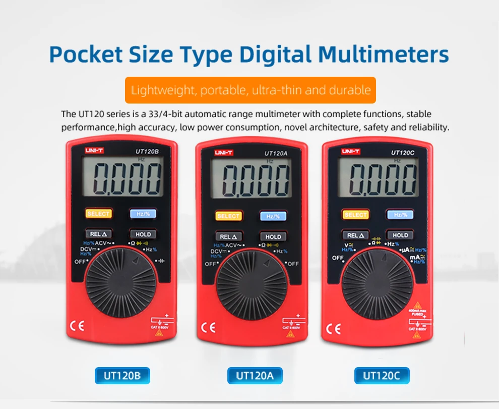 UT120 серии Мультиметры предназначены для DIYers и электроники инженеров и устранения неисправностей электронные системы развития и электронные схемы. Это простой и портативный мультиметр для каждого инженера электроники. Особенности; 1. Автоматическое отключение питания 2. Автоматический выбор диапазона измерения 3. 4000 дисплей, счетчик 4. Хранение данных и относительный режим 1 5. Постоянной ёмкости, универсальный конденсатор измерения