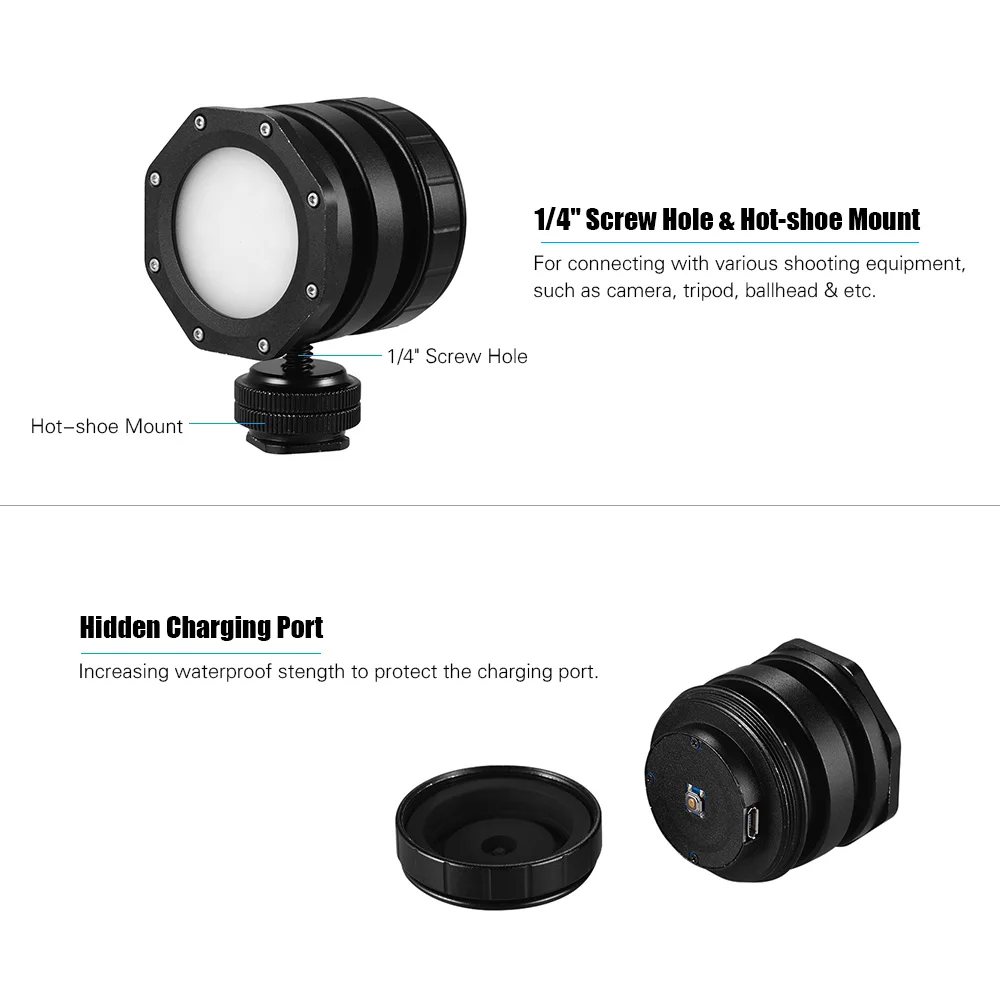 Водонепроницаемый светодиодный свет:IP67, полностью водонепроницаемый к подводным 3 м (9.8ft), цветовая температура 5600 K, регулируемая яркость (5 уровней), CRI 95 +, обеспечивают вам яркие и Реалистичные световые эффекты.
