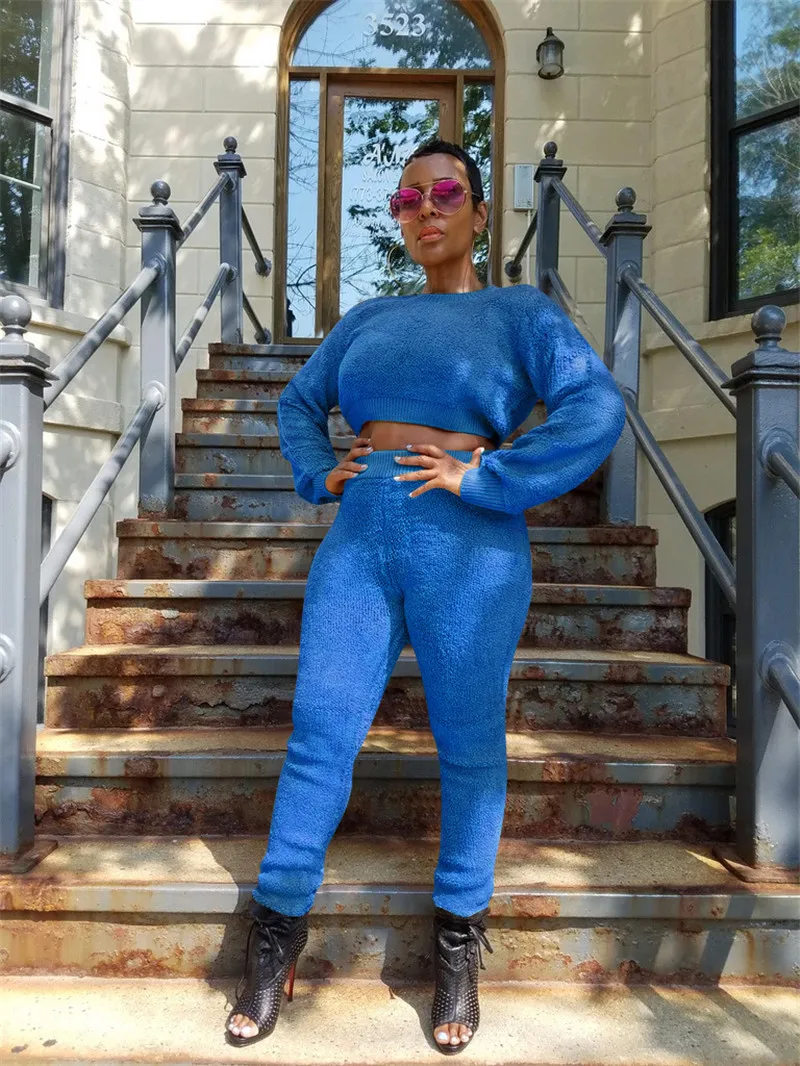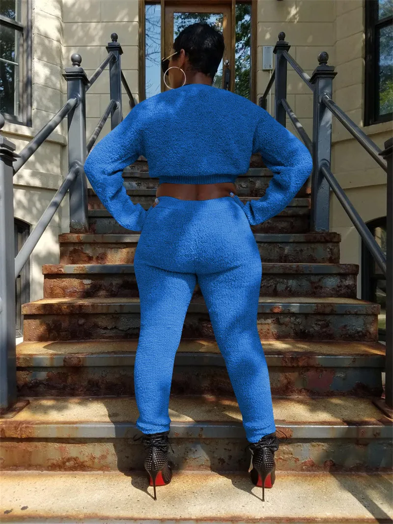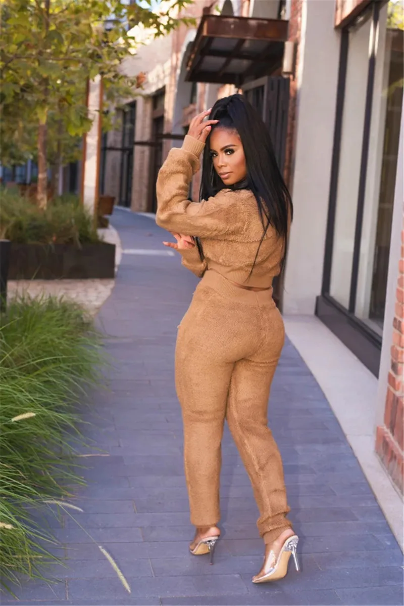 Женский комплект из двух предметов с плюшевой подкладкой Adogirl, теплый повседневный костюм с длинными рукавами, укороченный топ, брюки-карандаш, Осень-зима 2019
