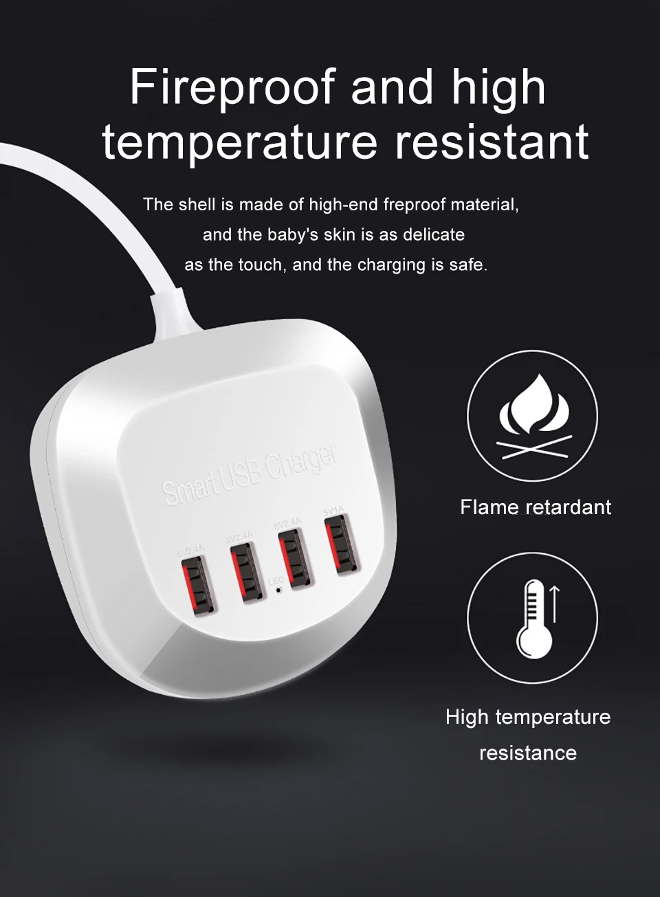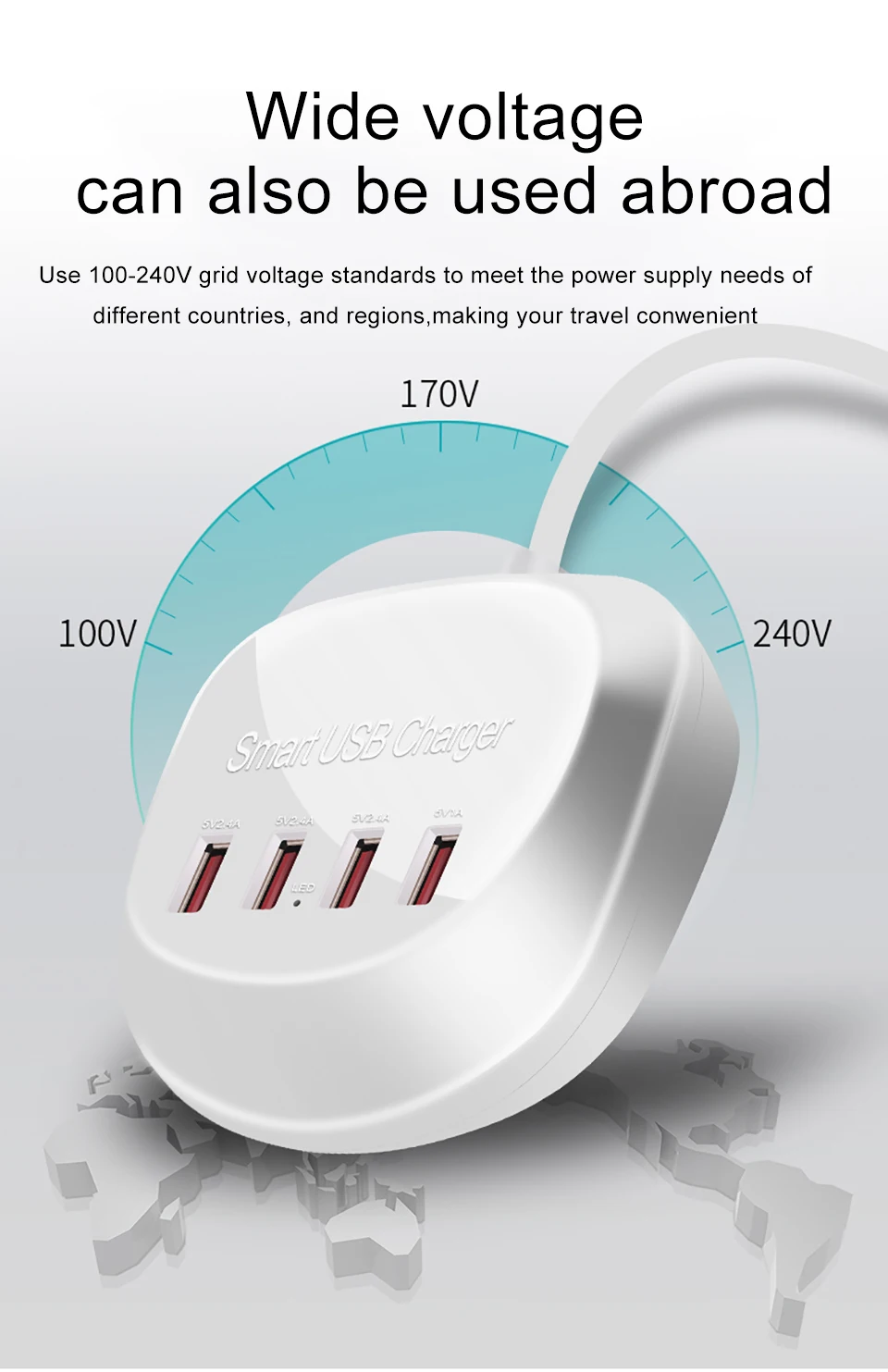 Умный дешевый USB Адаптер зарядного устройства для iPhone X XR 7 Xiaomi 9 samsung S10 Plus Phone 4 порта US Plug настольная зарядная станция Особенности: Входное напряжение: 100-240 В переменного тока/А. СУММАРНАЯ ВЫХОДНАЯ МОЩНОСТЬ: 5В/4A. Один выход USB: 5 В/1 А или 5 В/2,4 А Макс. Идеально подходит для дома, офиса, путешествий и других помещений. Совместим со всеми смартфонами, такими как для iphone, samsung, Xiaomi, huawei, LG, zte, lenovo, htc, sony, Google и планшетных ПК, камера, MP3, MP4 плеер, psp с USB-портом. 1,5 м провода.