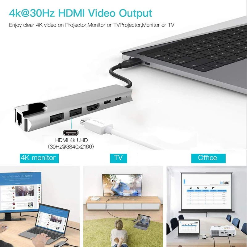 5 в 1 USB C концентратор:1 * HDMI + 2 * USB3.0 + 1 * PD + RJ45