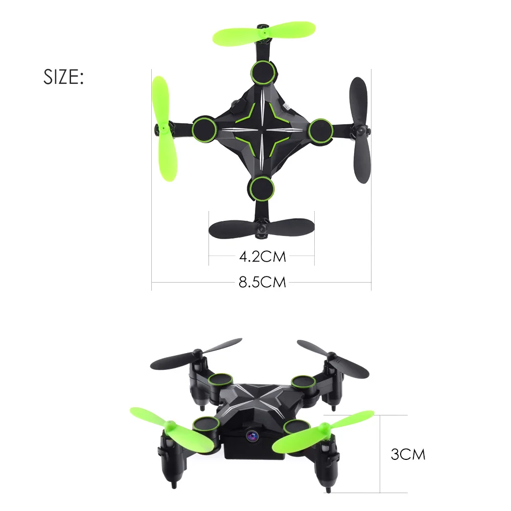 Особенности: 1. меньше и легче: всего 178 г, Размер в сложенном виде: 5*5*2,7 см 1,97*1,97*1,06 дюйма, размер в разложенном виде: 6,5*6,5*2,7 см 2,56*2,56*1,06 дюймов. 2. Возврат ключа: 2,4 ГГц широкий спектр, расстояние дистанционного управления составляет 100 м, супер скорость и сильные помехи, ключ может вернуть. 3. 360 градусов переворачивается и катится, вы можете управлять дроном, чтобы вращаться в 4 направлениях. 4. Безголовый мод-это просто кусок торта, чтобы вернуть ваш Дрон, даже если он летит далеко от вас. 5. Мигающий светодиодный фонарь, так что Дрон летит ночью более ослепительно, чтобы вы развлекались. 6. Мини складной Дрон, который вы можете положить в карман. 7. Черный цвет более холодный, чем белый. 8. с высокой точностью Wi-Fi функции камеры: ascend/спуск/вперед/назад/боковой полет/360°rolling action/H и L speed/светодиодный светильник/возврат одной кнопки/свободный, чтобы сложить, чтобы изменить форму, до тех пор, пока лезвие не прикасается к любой форме, можно снять.