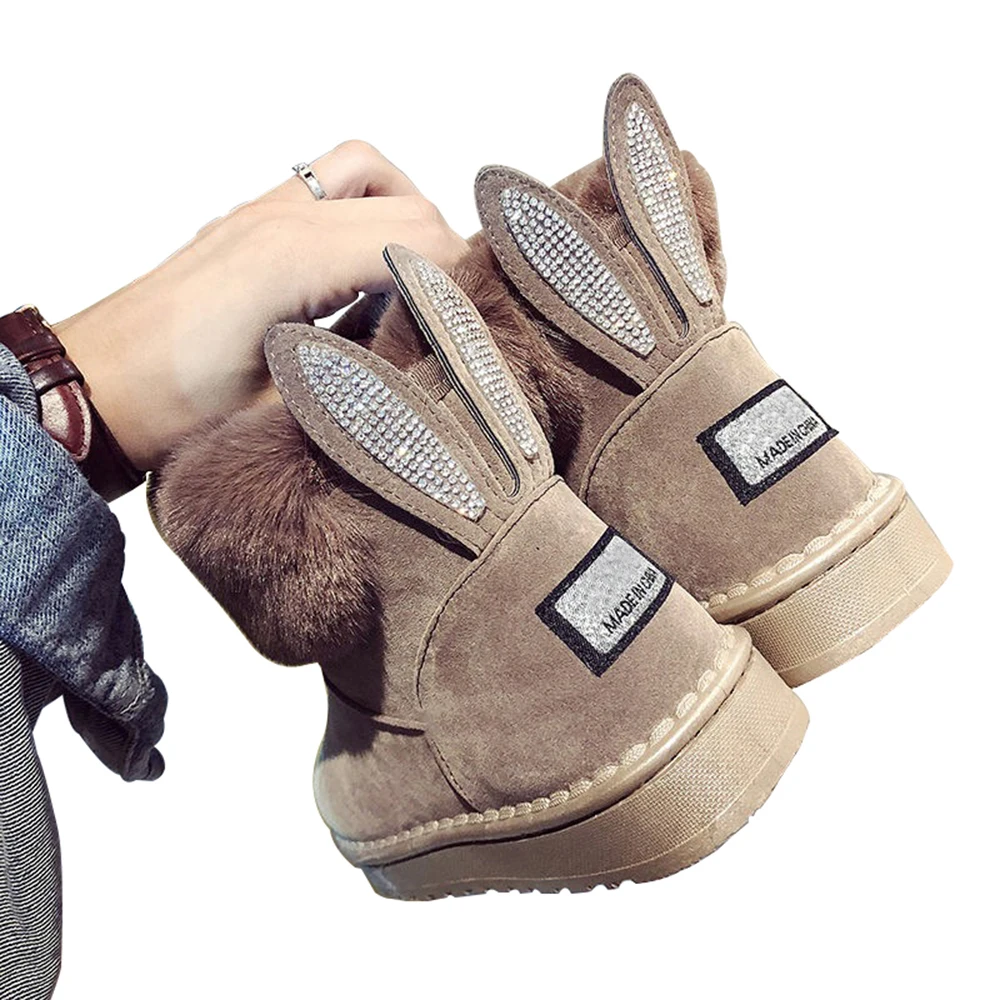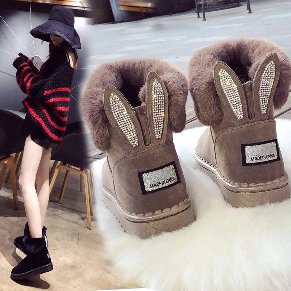 Женские зимние сапоги; Новое поступление; милые зимние сапоги со стразами и кроличьими ушками; повседневные утепленные теплые ворсистые сапоги до середины икры на плоской подошве