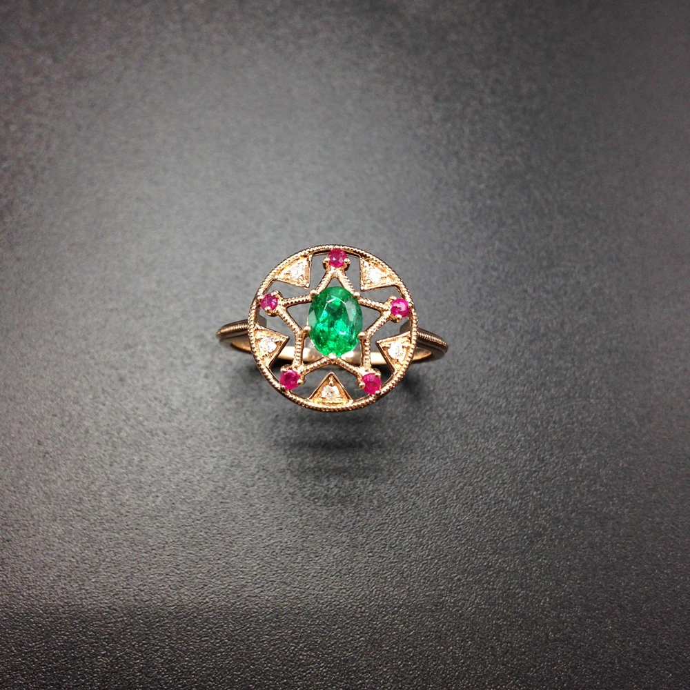 Тип: Кольцо Металл: розовое золото 18 К Вес металла: 2,18 г Драгоценный камень: Изумруд, рубин, алмаз Цвет камня: зеленый, красный, белый Метод Создания камня: натуральный Общий вес: 2,28 г Размер кольца: может регулироваться согласно запросу клиента Подарочная коробка: в комплекте