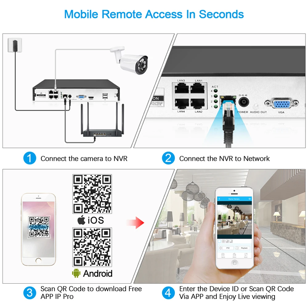 Нет дополнительных кабелей питания или адаптеров, просто подключив ip-камеру к NVR с помощью одного кабеля, вы можете легко завершить установку без знания о компьютере или сети и начать наслаждаться супер простым мониторингом среди вашего смартфона, планшета или ПК.