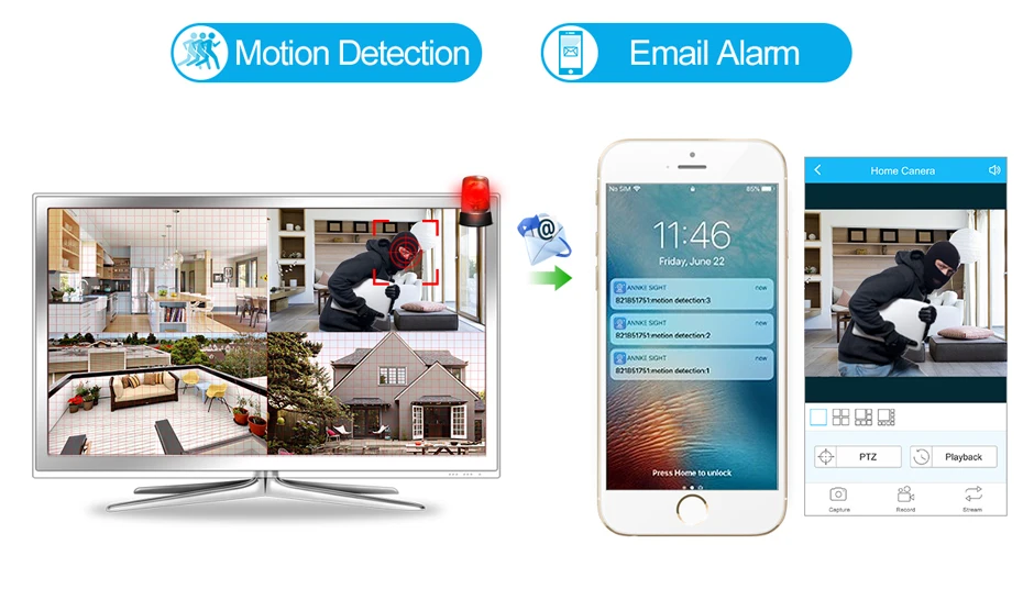 После легкой настройки зон обнаружения, каждое подозрительное движение вызовет оповещения, и сразу же отправляет оповещения по электронной почте и нажимает уведомления на ваше мобильное устройство. Он также загружает и сохраняет записанные изображения/видео на ftp-сервер.