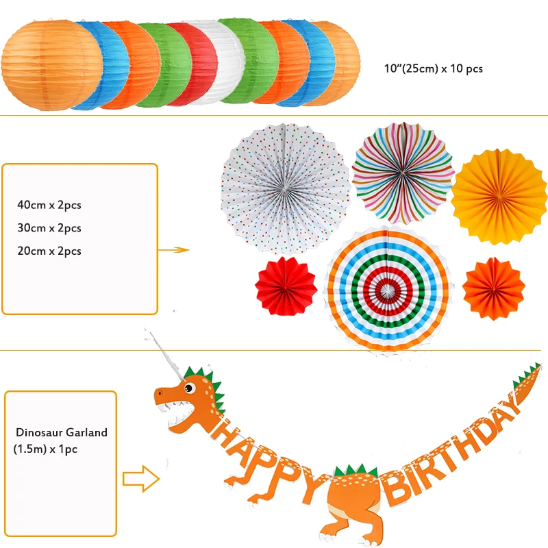 Комплектация: 1 гирлянда динозавра, 6 цветных бумажных вееров и 10 шт. 10 дюймов бумажных фонарей