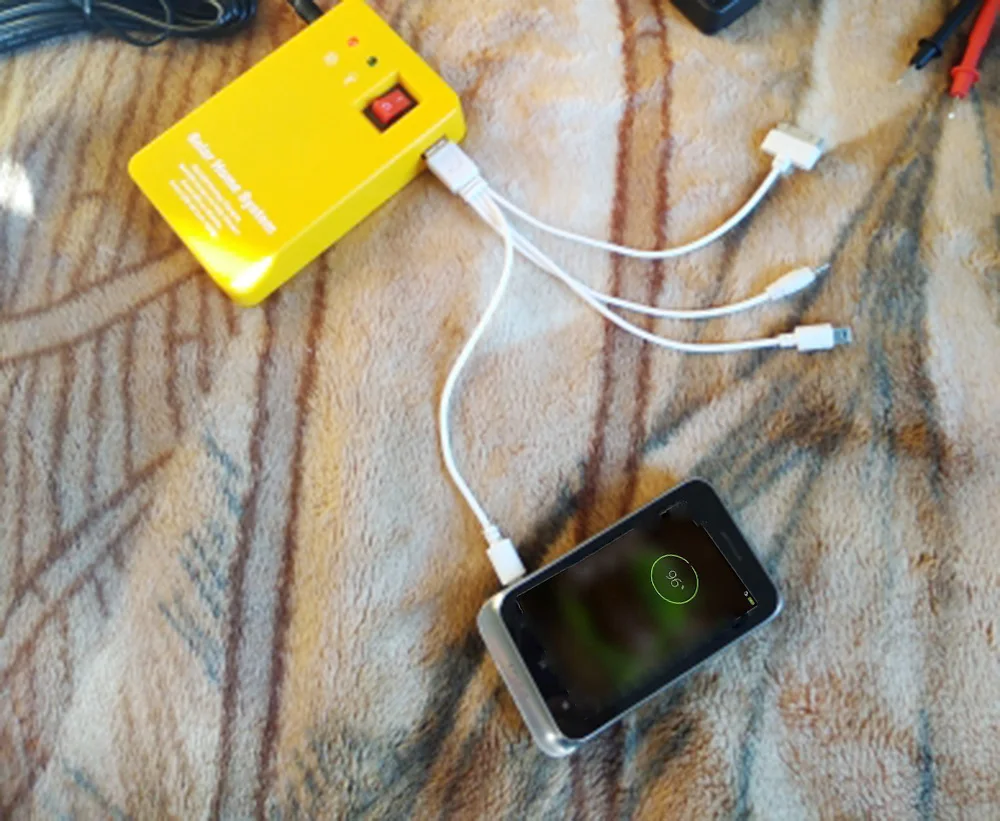 Особенности: -Вы можете использовать его в любом месте, когда есть достаточное количество солнечного света. -Он может заряжать мобильные телефоны, MP3, MP4, цифровые камеры и другие электронные продукты. -Идеалы для внутреннего освещения, наружного освещения, отключения питания, кемпинга, домашнего освещения, районов без электричества. -С отверстием для переноски, обеспечивающим быструю и удобную мобильность. Одна кнопка питания, простота в эксплуатации. -Солнечная система имеет защиту от перегрузки Когда переключатель в 1 состоянии, зеленый световой светильник не яркий, он показывает, что аккумулятор уже полностью разряжен, выход системы автоматически отключается, прекратите предоставлять светильник и мобильный телефон. Параметры: -Солнечная панель: 6 В/3 Вт -Кабель панели: 4 м -Батарея: 3,7 V 4000mAH литиевая батарея -Лампы: 0,9 Вт 90LM -Выход USB: 5 В 500 мА Электрический генератор Линия солнечной панели подключается к солнечной системе на левом интерфейсе, около 10 часов может быть заполнена системой батареи. Взимается один день (с 9:00 до 5:00) * 1 светильник освещается в течение 10 часов * 2 лампы-светильник освещаются в течение 5 часов Шнур лампы в солнечную систему на интерфейсе, подключите кабель лампы в гнездо, которое отмечено * 1 светильник освещается в течение 20 часов * 2 лампы-светильник освещаются в течение 10 часов Посылка включает в себя: -1X Электрический генератор -1X Панели солнечные -3x светодиодный лампы (с переключателем on line) -1X USB кабель для зарядки (1 линия 4 головки) -1X руководство по эксплуатации на английском языке