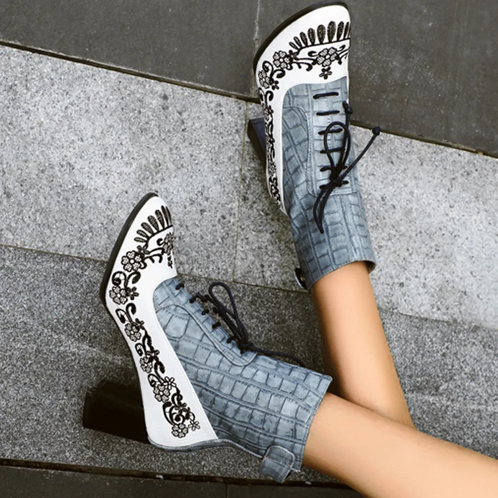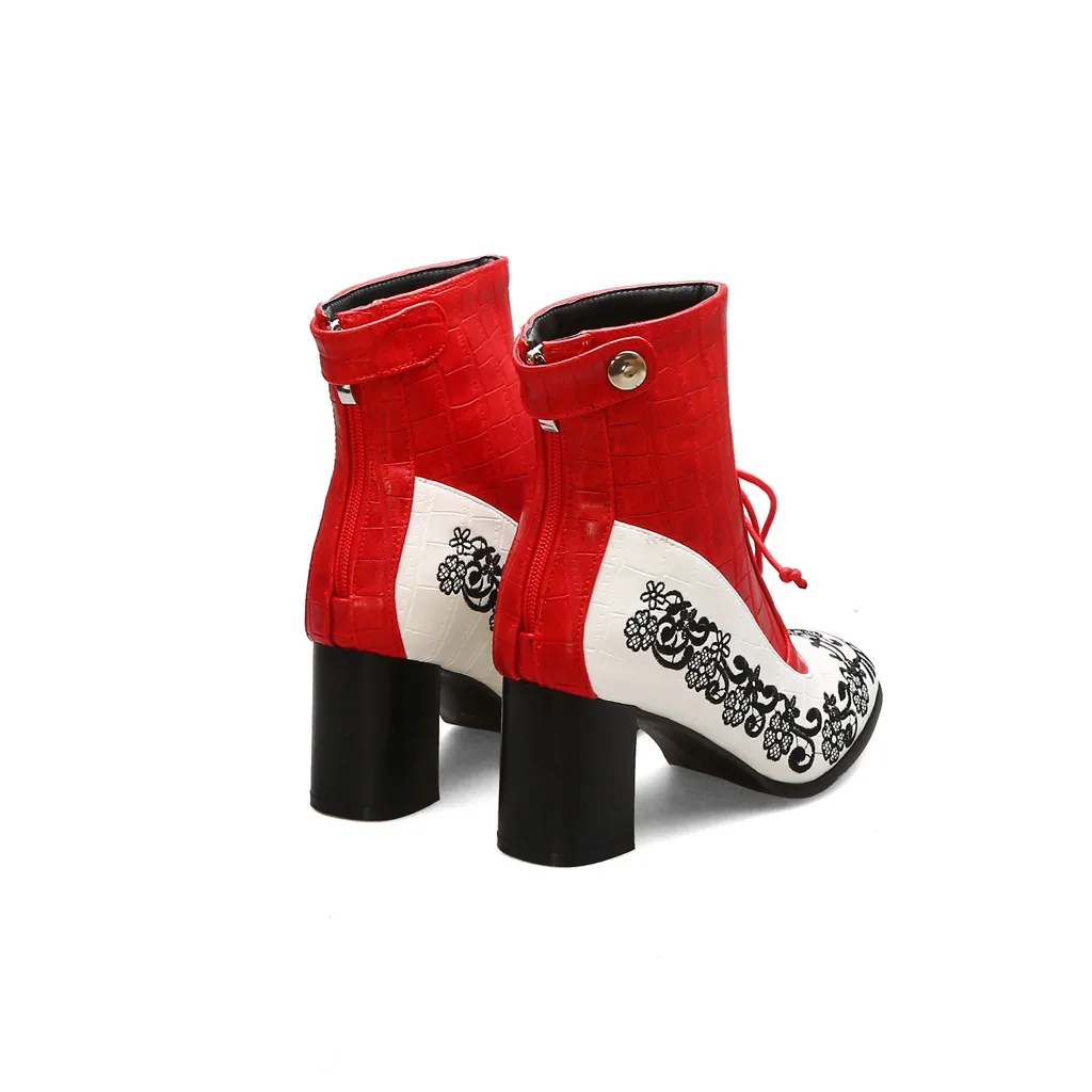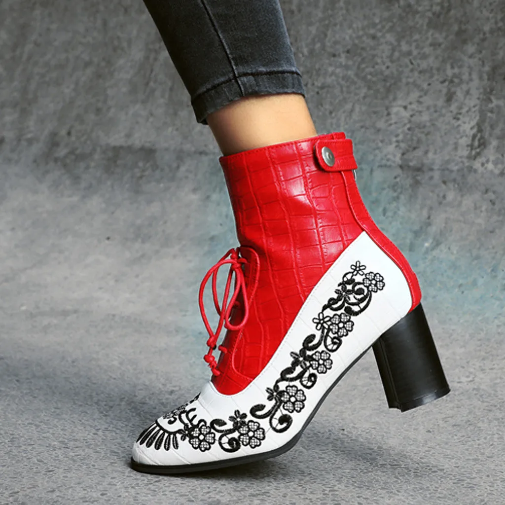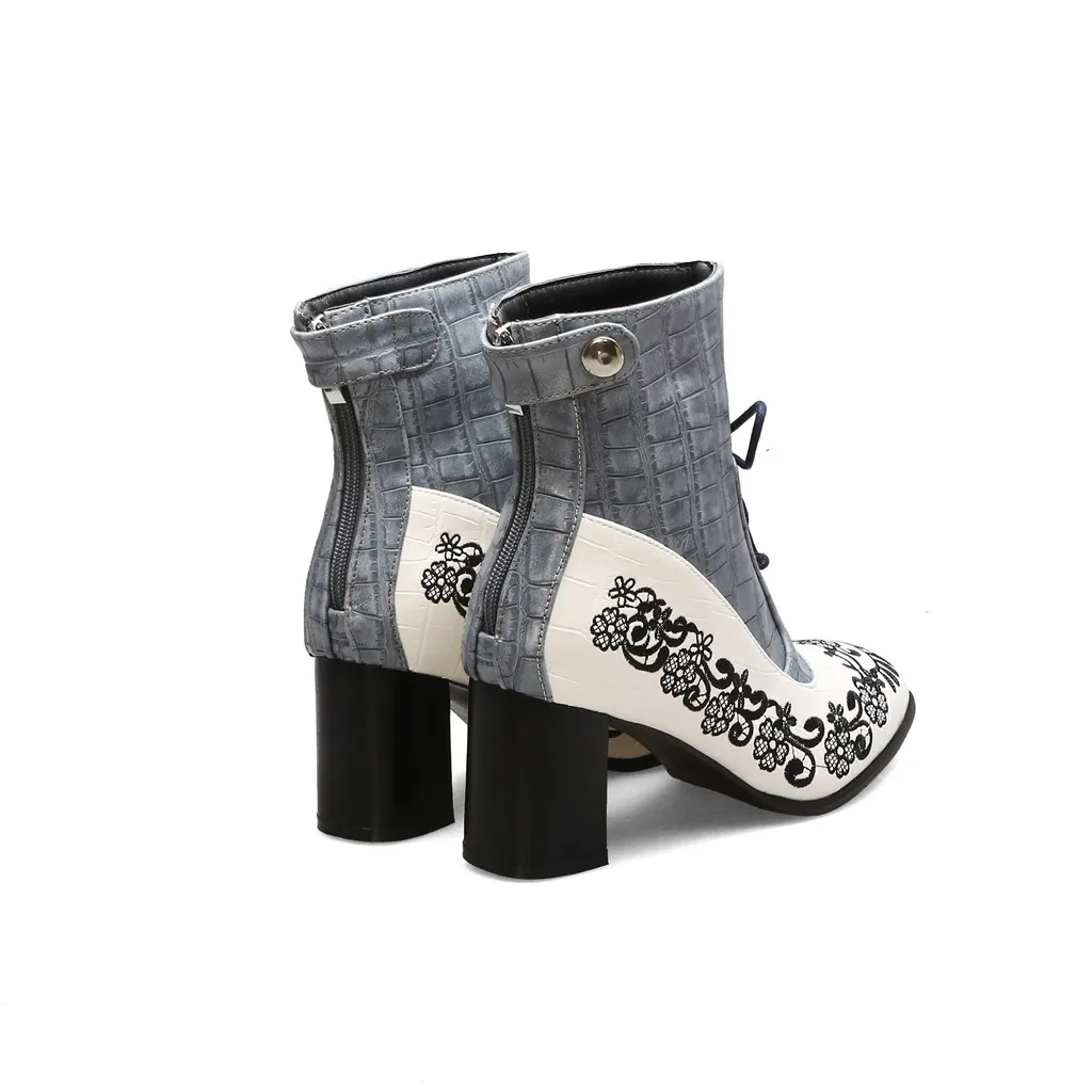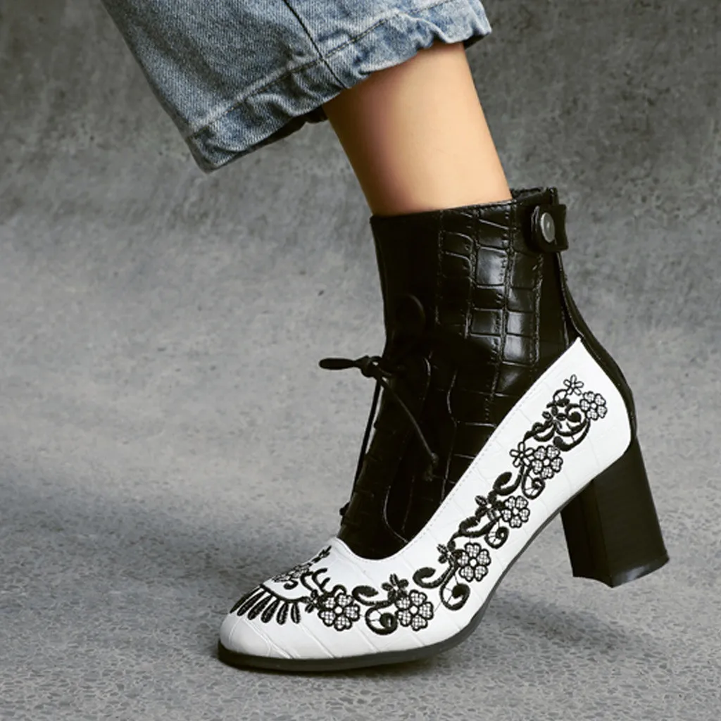 Women's Fashion Embroidered Booties Side Zipper Embroidery Flowers Lace-Up Shoes