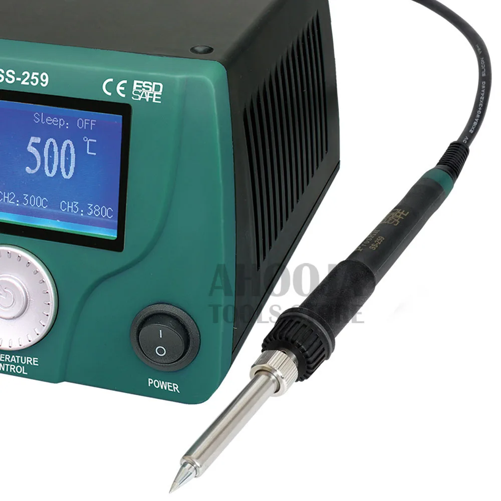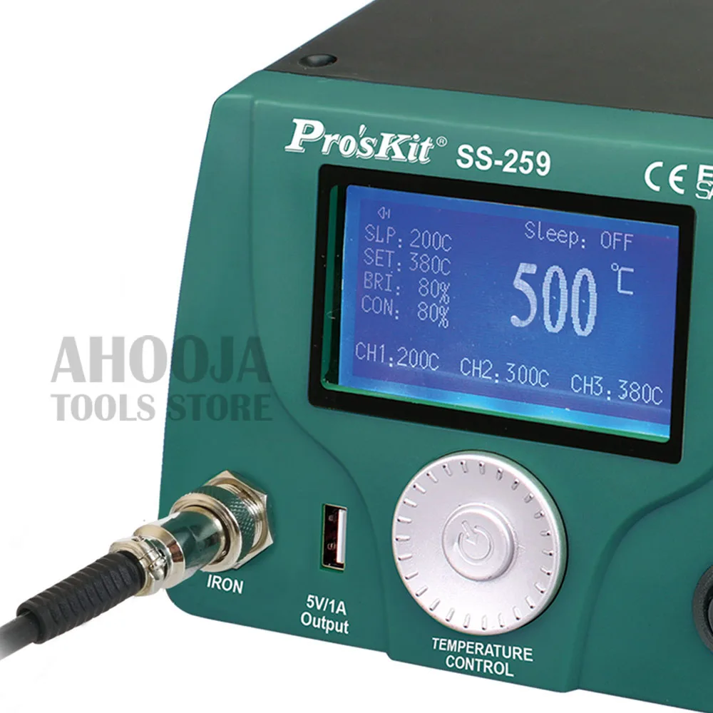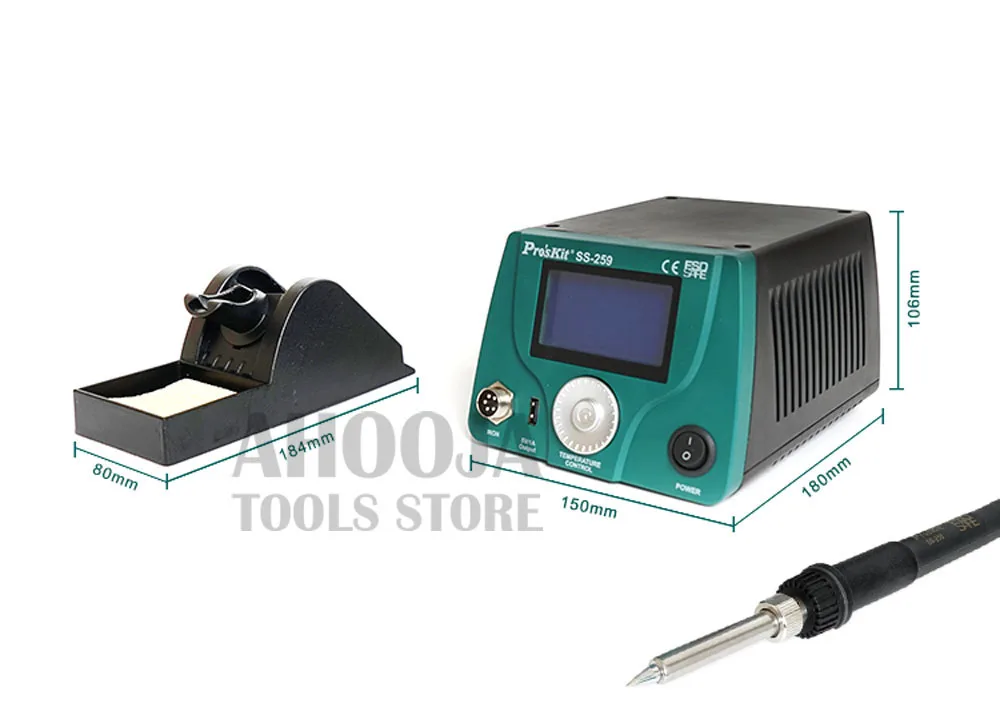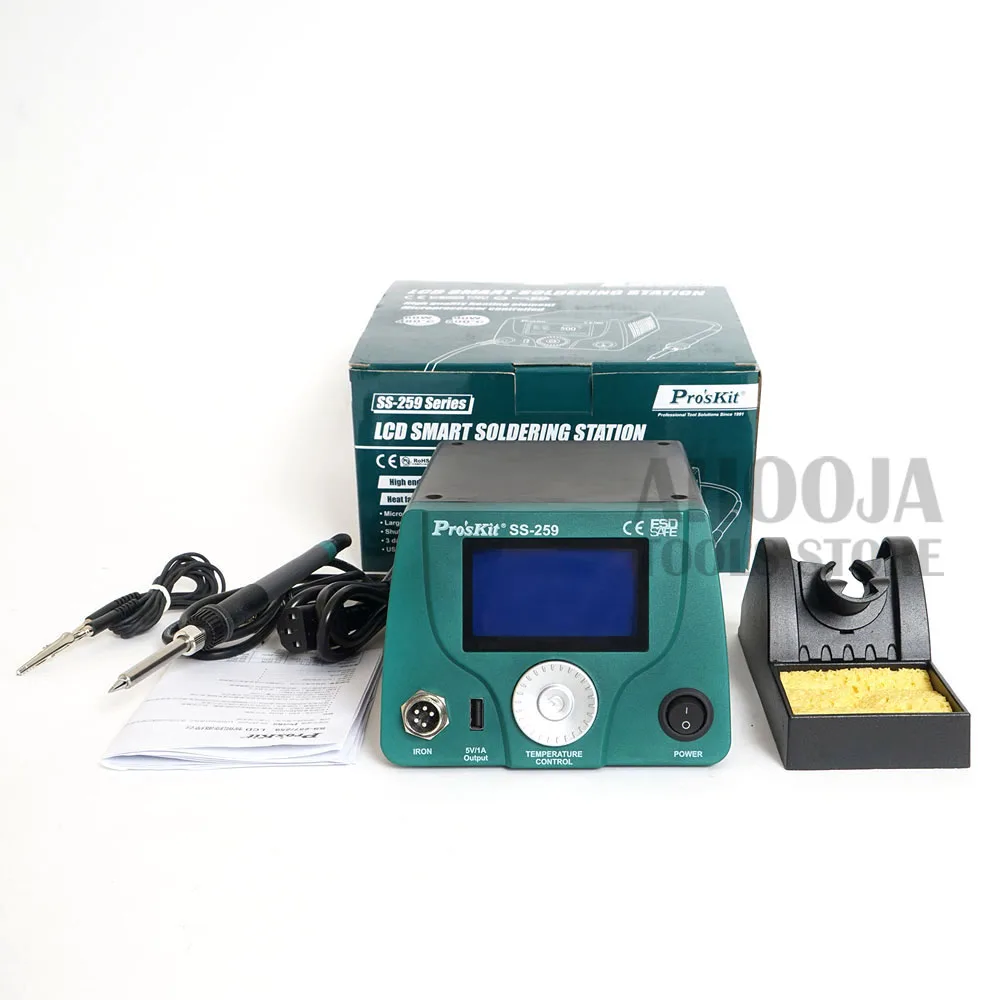 Pro'skit 90 Вт ЖК-цифровой дисплей интеллектуальный контроль температуры паяльная станция антистатический термостат паяльник сварка Особенности: SS-259H ЖК Смарт паяльная станция Высокий конец Нагреватель из серебристого сплава Быстро нагревается 19 сек до 300 °C Управление микропроцессором Особенности лучшей производительности и точного контроля температуры. Функция калибровки температуры Функция автоматического сна и пробуждения, Блокировка системы, калибровка наконечника и низкое потребление. Большой ЖК-дисплей с дизайном ручки Большой экран с подсветкой, контрастность жк-дисплея и яркость регулируются. Разработан с функциональной ручной ручкой и ручкой для удобства установки, более удобный и удобный в использовании. Высококлассный нагреватель из серебряного сплава Поставляется с высококачественным нагревателем из серебряного сплава для быстрого восстановления тепла. 19 секунд до 300 °C. 3 памяти данных Храните и запоминайте 3 номера часто используемых температур. Выходная мощность USB 5 В/1 А Встроенный usb-порт постоянного тока 5 В/1 А для источника питания. Характеристики: Особенности: SS-259H Входное напряжение: 220 ~ 240 В переменного тока 50 Гц Система управления: светодиодный индикатор с микропроцессором Потребляемая мощность: 90 Вт Дисплей: LCD 73mmX40mm, 240X120 dot. Подсветка Диапазон температур: 30 ~ 500 °C ± 10 °C /86 ~ 932 °F ± 50 °F Калибровка температуры: 0 ~ 699 °C(32 ~ 1290 °F), регулируемая Стабильность температуры: ± 2 °C/± 36 °F (без нагрузки) Нагревательный элемент: высококлассный нагреватель из серебряного сплава Режим сна: Выкл и 1 ~ 360 мин регулировка Выходное напряжение: 25 В переменного тока Температура режима сна 30 ~ 400 °C/86 ~ 752 °F Выход usb-порта: 5 В/1 А постоянного тока Сопротивление от наконечника до земли/потенциал: ≦ 2Ω/≦ 2mV Сменный нагреватель: 9SS-259-HT Паяльник: 9SS-259-SI Размер: 180x150x106 мм Вес: 2,3 кг Сертификат: RoHS