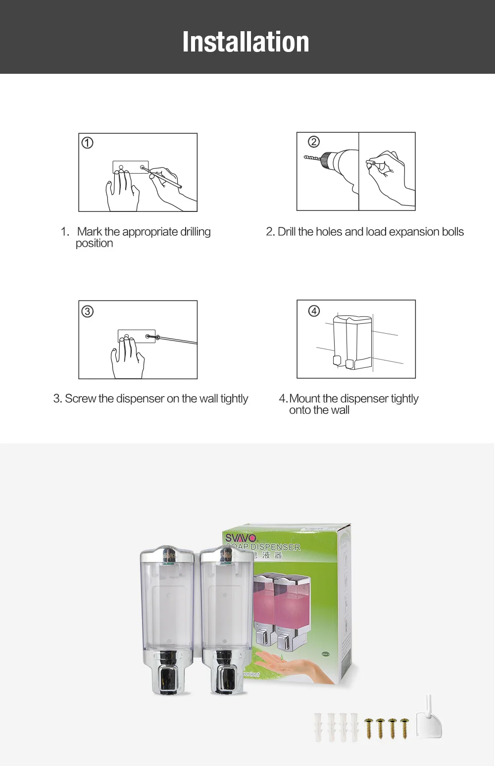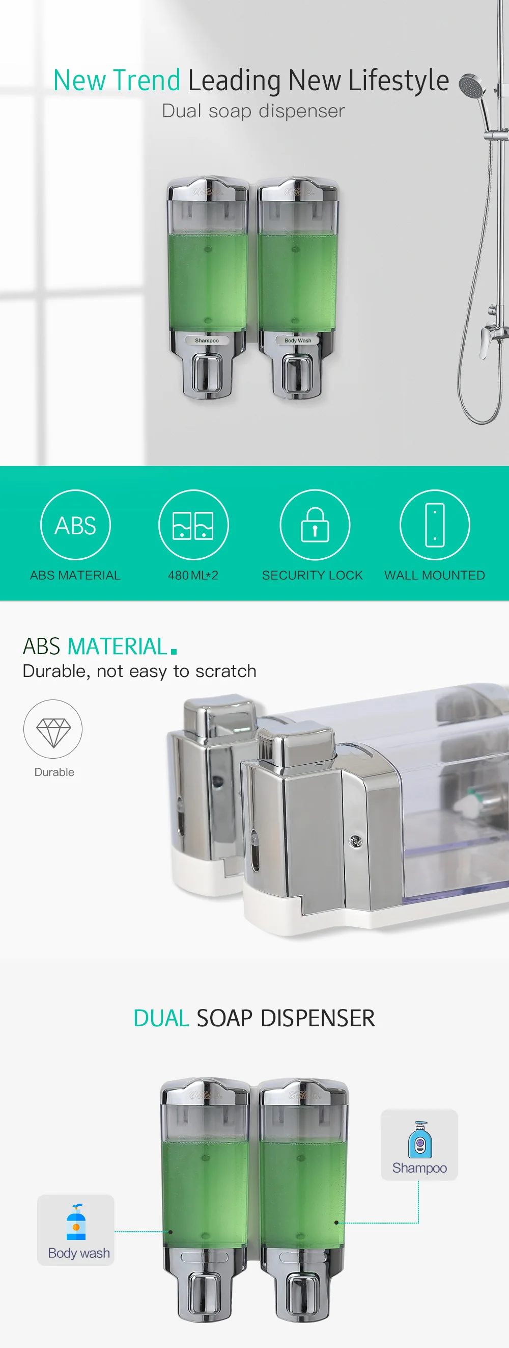 -Прочный материал-изготовлен из экологически чистого АБС-пластика, долговечная работа с использованием высококачественного водонепроницаемого АБС-пластика. -Настенный-Простая установка и экономия места, решение проблем с душевыми бутылками, полками, кухонной раковиной или умывальником. -Емкость 480 мл * 2-ясно, чтобы просмотреть дозировку на прозрачной бутылке и пополнять вовремя, может содержать 480 мл * 2 жидкости за один раз. -Жидкость на выходе-не протекающая конструкция, полностью отрезает поток мыла, помогает уменьшить беспорядок и распространение микробов. -Рекомендуемое использование-подходит для ванных комнат, кухонь, офисов, больниц, отелей, ресторанов и других общественных мест.