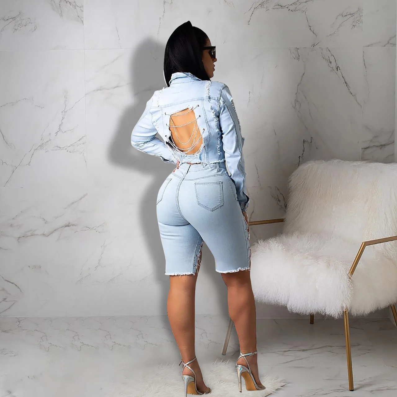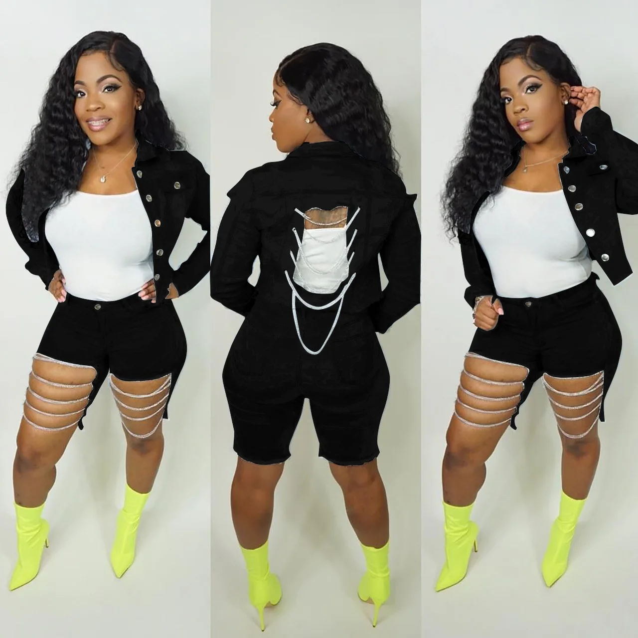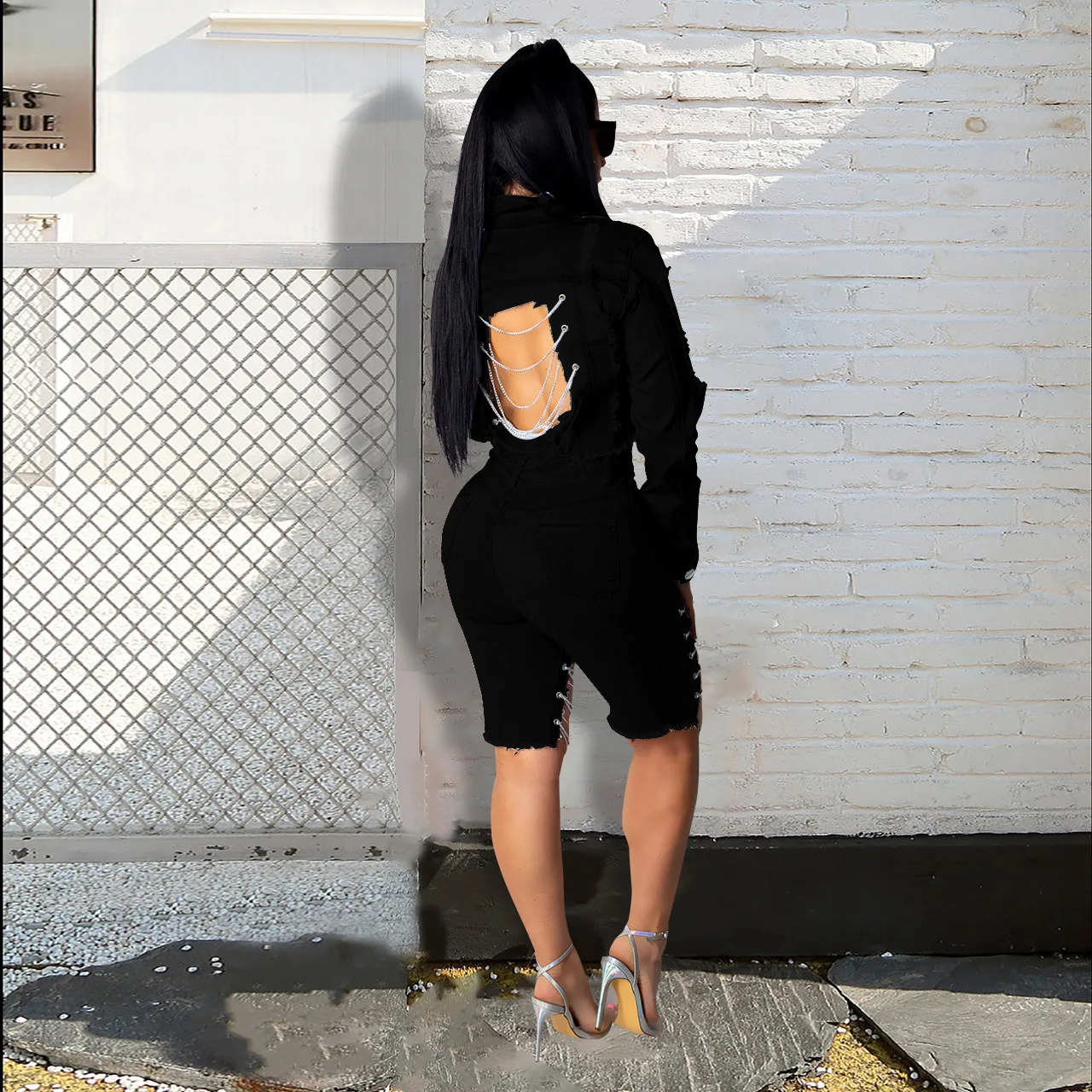 Женский ковбойский костюм из двух предметов: пальто с длинным рукавом + короткие штаны с цепочкой, черный/синий спортивный костюм, вечерние штаны