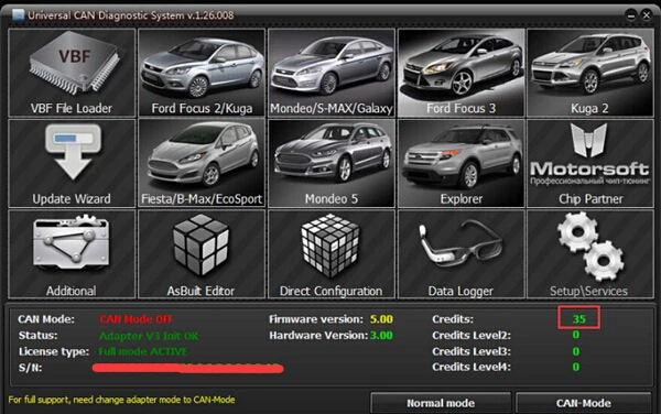 1. Диагностировать большинство автозапчастей и компонентов, которые соединены с центральным электрическим модулем (GEM, BCMii) через шину данных (CAN); 2. Получение данных, встроенных в компоненты и модули автомобиля, включая их номер детали, версию, калибровку, серийный номер; 3. Внесите необходимые изменения в центральную конфигурацию автомобиля и при необходимости измените конфигурацию модулей и компонентов; 4. Обновление калибровки (прошивки) модулей и компонентов транспортного средства, включая двигатель (так называемая Настройка чипа); 5. Регулярно адаптируйте звуковые модули, изготовленные компанией SONY (только на русском языке); 6. Обновление (замена) программного обеспечения дверных модулей для активации автоматических складных зеркал. 7. Другое UCDS состоит из драйверов последовательной шины USB-serial (Рекомендуемые драйверы FTDI), аппаратного адаптера и фактического UCDS-programm. Программный интерфейс интерфейса UCDS имеет режим главного окна. Вам нужно выбрать тип транспортного средства или выбрать режим обслуживания для обновления прошивки адаптера или других функций обслуживания. UCDS в настоящее время работает со следующими платформами: Focus II 2004-2011; Focus III 2011, 2015 ; Kuga I, Kuga II; C-MAX; S-MAX; MONDEO IV; Mondeo 2015 ; Galaxy ; Tansit; Fiesta 2008, 20015 и т. д.