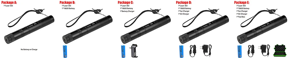 посылкаC: Лазерная 303+ 18650 Батарея+ Батарея Зарядное устройство посылкаD: Лазерная 303+ 18650 Батарея+ Зарядное устройство переменного тока+ Автомобиля Зарядное устройство посылкаE: Лазерная 303+ 18650 Батарея+ Зарядное устройство переменного тока+ Автомобиля Зарядное устройство+ Ящик для инструментов Примечание: Англия отправляет зарядное устройство с вилкой Великобритании. Австралия, Новая Зеландия отправить AU plug зарядное устройство. В Европу и другие страны поставляется зарядное устройство с вилкой европейского стандарта. Канада, США, Япония и Мексика отправляют нам зарядное устройство.