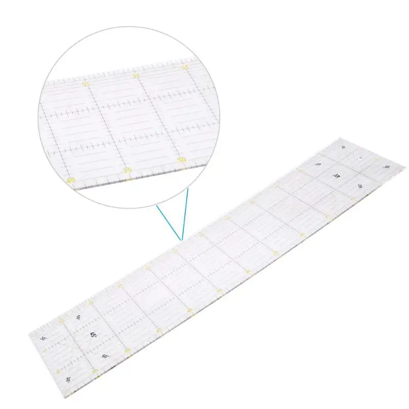 Материал: прозрачный акриловый материал, изысканный процесс печати, не легко выцветаетПрименение: измерительный инструмент, инструмент для рисования, может использоваться с колесным ножом в качестве режущей линейки
