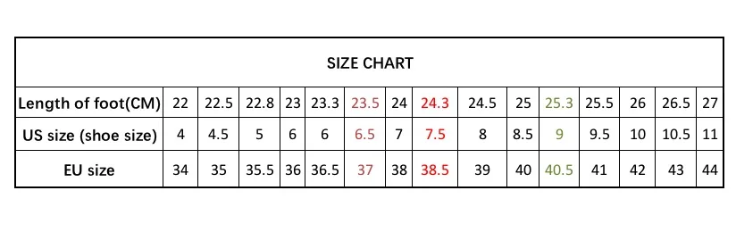 Пожалуйста, обратите внимание на таблицу размеров. 1. Пожалуйста, сначала измерьте свою стопу, а затем выберите Размер соответственно, не выбирайте размер непосредственно на основе вашего обычного уличного размера обуви; 2. Длина единицы измерения составляет см (Сантиметр), f.y.i. 1 см = 0,393 дюйма, 1 дюйм = 2,54 см; 3. Вся обувь измеряется вручную, это может быть разница в 1-2 мм с точным размером правил, спасибо за понимание.