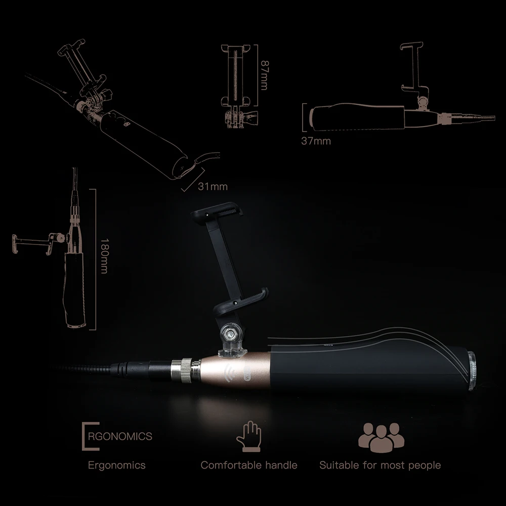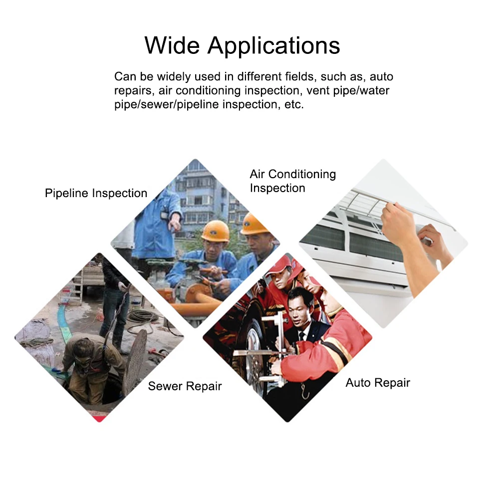 Этот эндоскоп является очень удобным и практичным устройством в вашей повседневной жизни, так как он может помочь вам просматривать места, где нормальная камера труднодоступна, особенно для того, чтобы помочь вам найти что-то, что выпало в небольшом уголке или осмотреть трубы, оборудование и мелкие детали в сборе. Это незаменимый инструмент для проверки и может использоваться в различных областях, таких как авто ремонт, контроль кондиционирования воздуха, вентиляционные трубы/водопроводные трубы/канализационные/Трубопроводные инспекции и т. Д. Кроме того, он оснащен держателем на мобильный телефон, более удобным в использовании. Подходит для смартфонов iOS/Android.