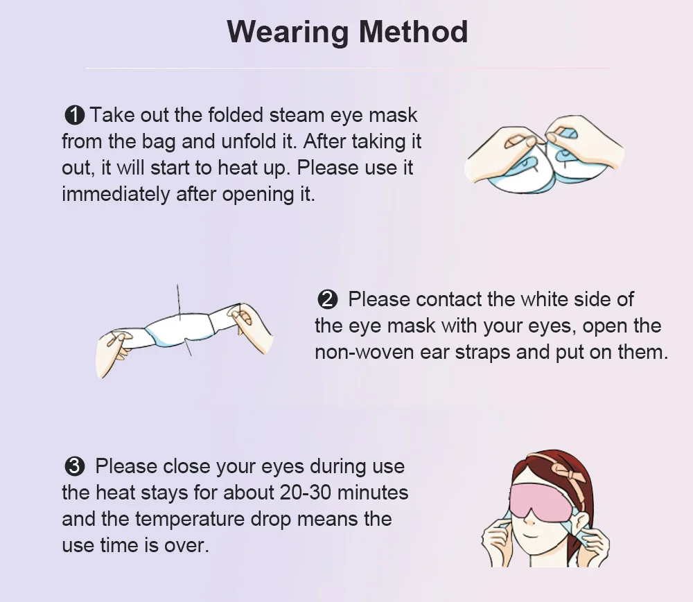 Пять видов:🌼Роза: яркий кожи вокруг глаз🌼Без отдушек: снимает усталость глаз🌼Ромашка: защита зрения🌼Бледно-лиловый: успокаивает настроение и Стравливание🌼Жасмин: спать с комфортомСпособ использования:1. Откройте упаковку и выньте изделие из упаковки. Этот продукт не начнет нагреть при контакте с воздухом.2. Положите белую поверхность в контакте с глазами, Повесьте изделие на обоих ушах и наслаждайтесь горячим паром спа-салон30 минут.Примечание: