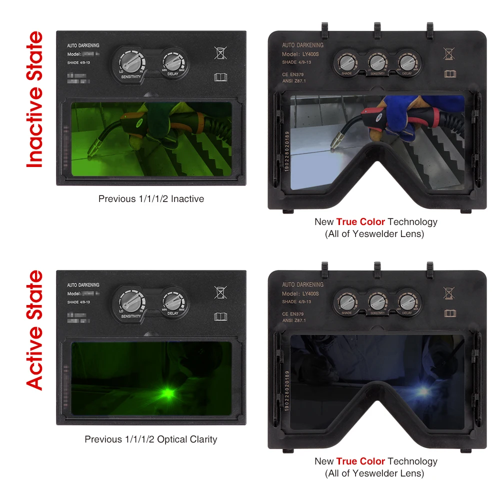 Модели фильтра LYG400S Фильтр Размеры 138,4 × 113,5 × 9 мм Активная зона видимости 110 × 60 мм (4,33 "× 2,36") Светильник тени DIN4 Темным оттенком DIN9 ~ DIN13 Способ изменения темного состояния Плавная переключения Время переключения ≤ 1/10000 с Регулировка чувствительности Плавная переключения Время задержки 0,1 ~ 0,8 S Питание 2 × CR2450 литиевая батарея и солнечная поставка Номинальная емкость литиевой батареи 1200 мА-ч Сменная литий Батарея Да Операционной Температура -5 ~ 55 °C Датчиков, направленных на сварочную дугу 2 Защитите Класс от ультрафиолетовых лучей спектров DIN16 Молотилка Нет Крой Нет Низкая Батарея Нет Тесты Нет