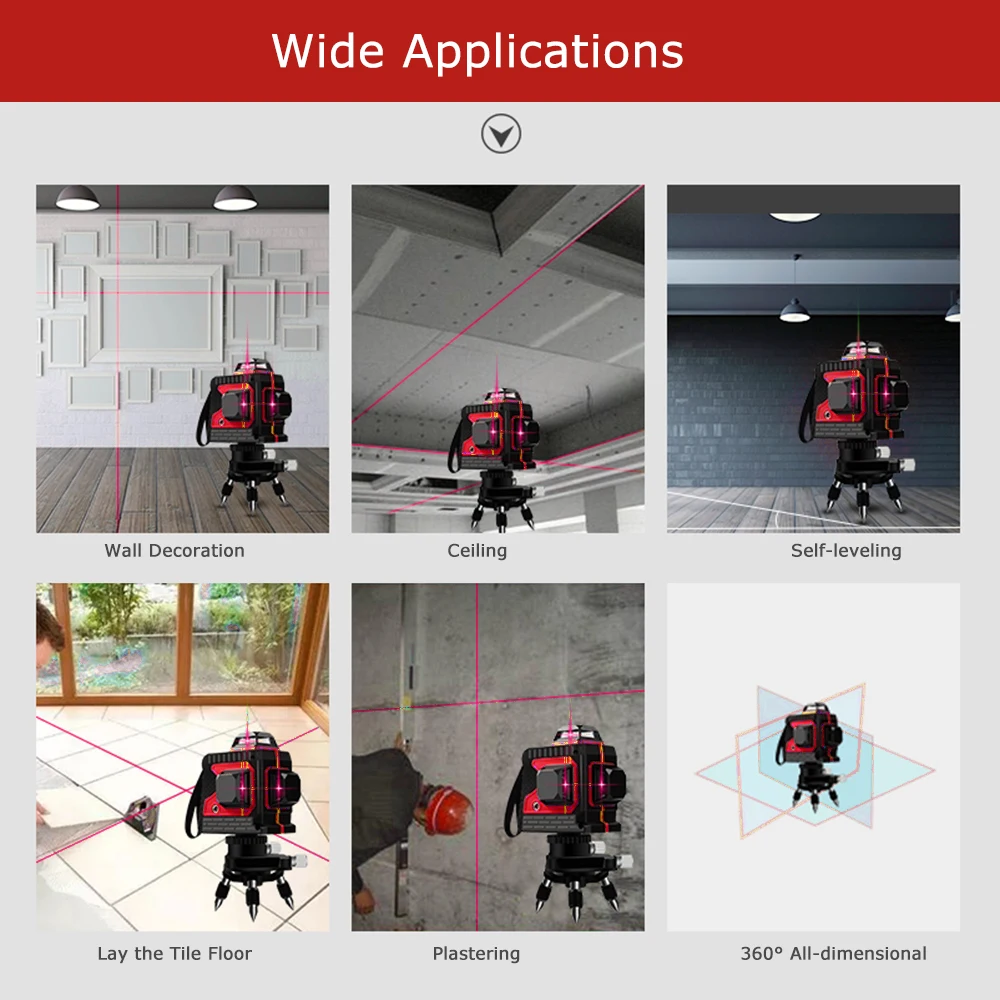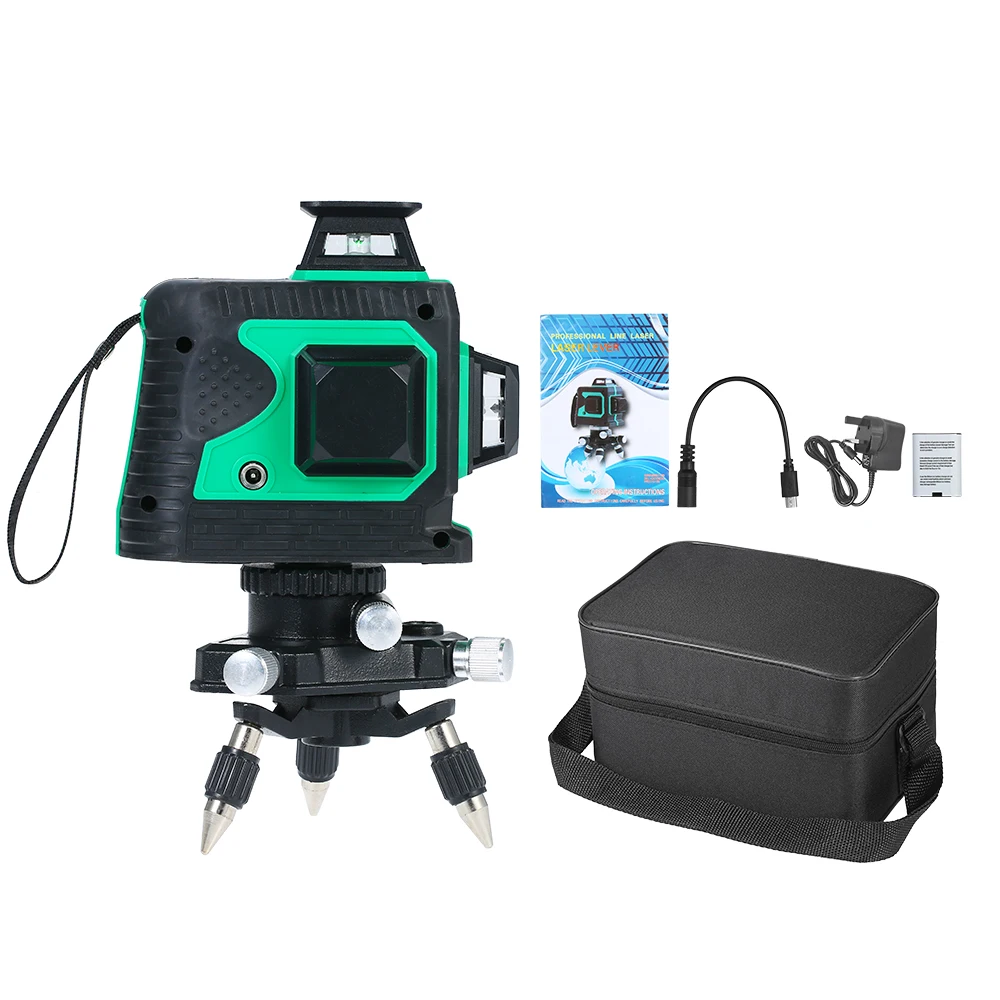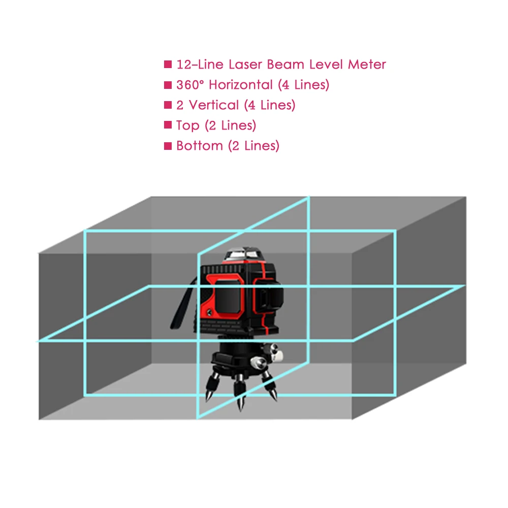 3D 12 lines laser level with high brightness laser and long projection distance, can emit 360 degree visible laser beams both horizontally and vertically.