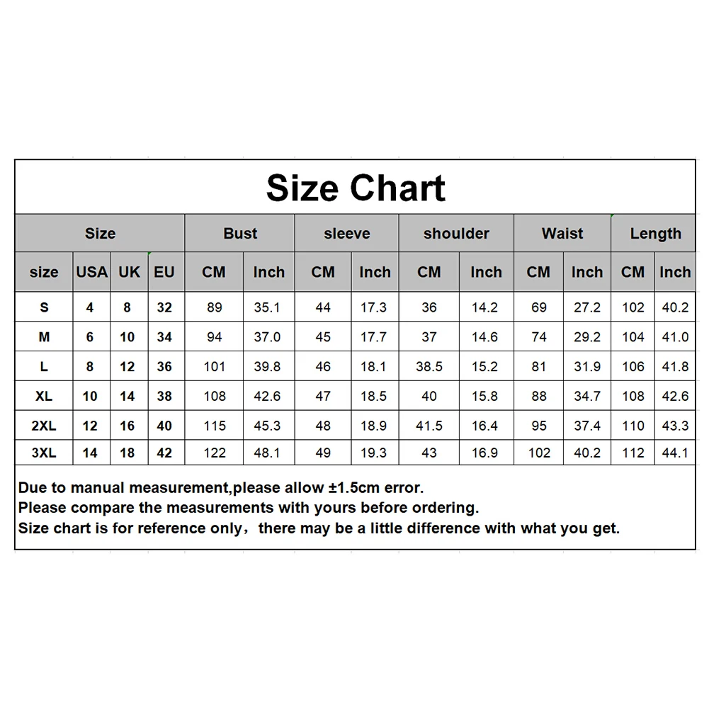 [Наш Размер 2XL] плечо: 41,5 см/16,34 дюйма, рукав: 48 см/18,90 дюйма, обхват груди: 115 см/45,28 дюйма, обхват талии: 95 см/37,40 дюйма, длина: 110 см/43,31 дюйма (прибл.)