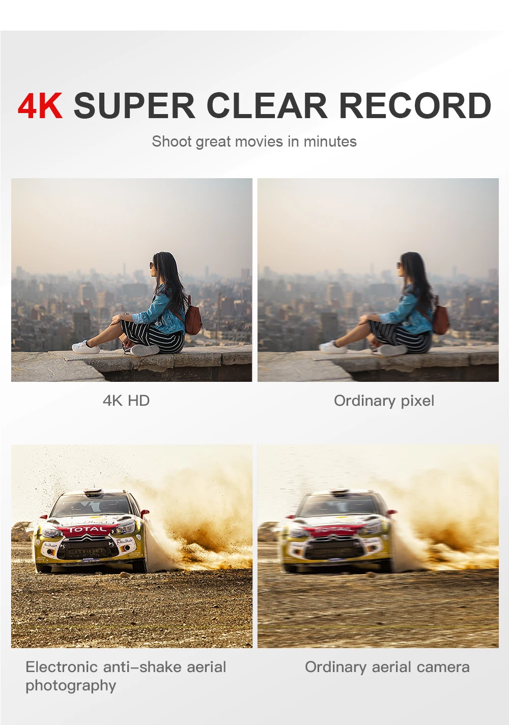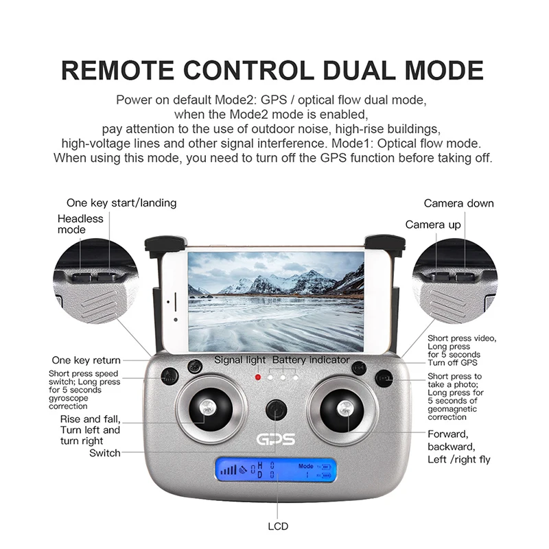 Функция: 5G Wi-Fi FPV, ESC камера, двойная камера, широкоугольная камера, приложение управления полетом, GPS автоматическое возвращение, режим следования за мной, режим высоты, режим полета путевой точки, оптическое позиционирование потока, объемное изображение с фиксированной точкой, фото/видео с жестами, креативное видео, режим VR, режим Безголового движения, фиксированное переключение, регулировка скорости полета на 3 уровня, снятие/посадка одной кнопкой, возврат одной кнопкой