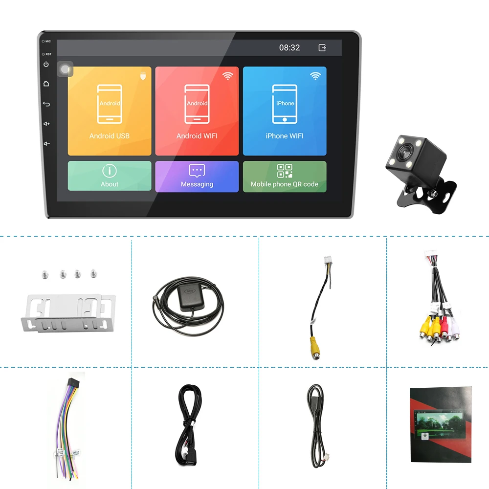 1 х Автомобильный MP5-плеер 1 x Кабель Питания 1 x Антенна GPS 1 x вход камеры 1 x RCA вход и выход 2 x USB-кабеля Металлический каркас-2 шт. 4 x винт 1 x Руководство по эксплуатации