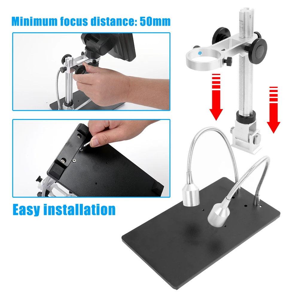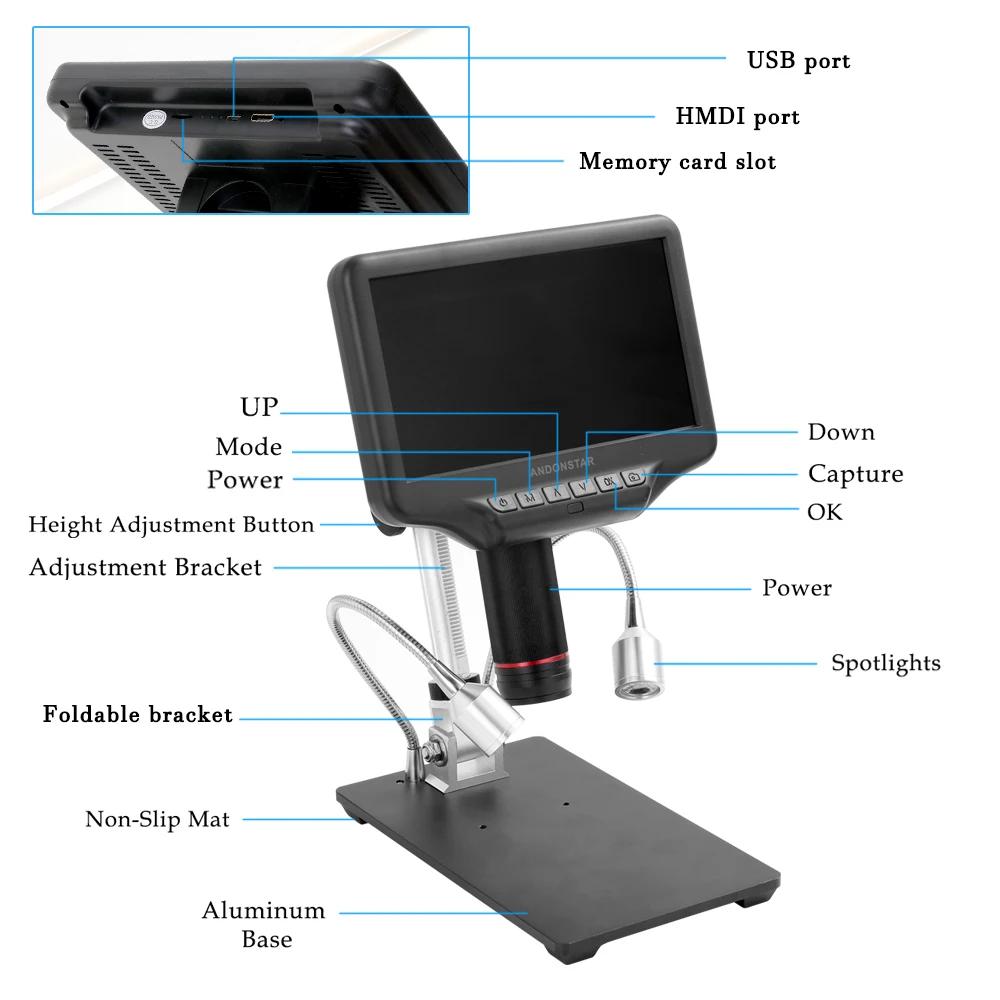 7-дюймовый ЖК-Дисплей: 7-дюймовый дисплей приносит вам идеальный визуальный опыт. Для большинства людей внешний дисплей больше не требуется, микроскоп сам может удовлетворить все их визуальные требования.
