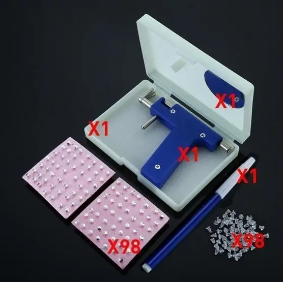 Ушной пистолет + зеркало + ручка + подходящая пластиковая коробка или ушной пистолет + зеркало + ручка + подходящая пластиковая коробка + Ушные Шпильки