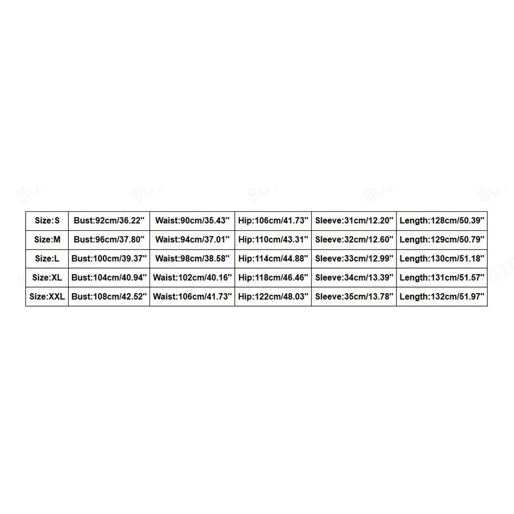 Размер Бюст Талия Рукав Бедра Длина S 92 см/36,22'' 90 см/35,43'' 31 см/12,20'' 106 см/41,73'' 128 см/50,39'' М 96 см/37,80'' 94 см/37,01'' 32 см/12,60'' 110 см/43,31'' 129 см/50,79'' L 100 см/39,37'' 98 см/38,58'' 33 см/12,99 дюйма 114 см/44,88'' 130 см/51,18'' XL 104 см/40,94'' 102 см/40,16'' 34 см/13,39'' 118 см/46,46'' 131 см/51,57'' XXL 108 см/42,52'' 106 см/41,73'' 35 см/13,78'' 122 см/48,03'' 132 см/51,97''