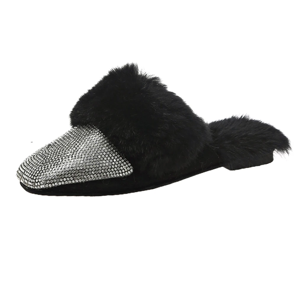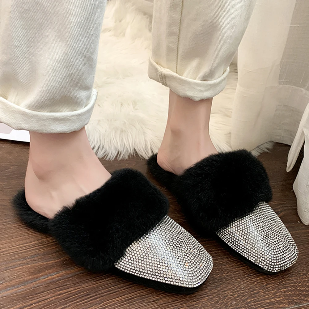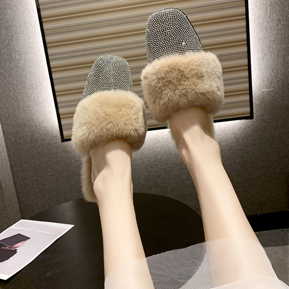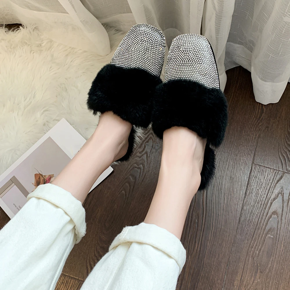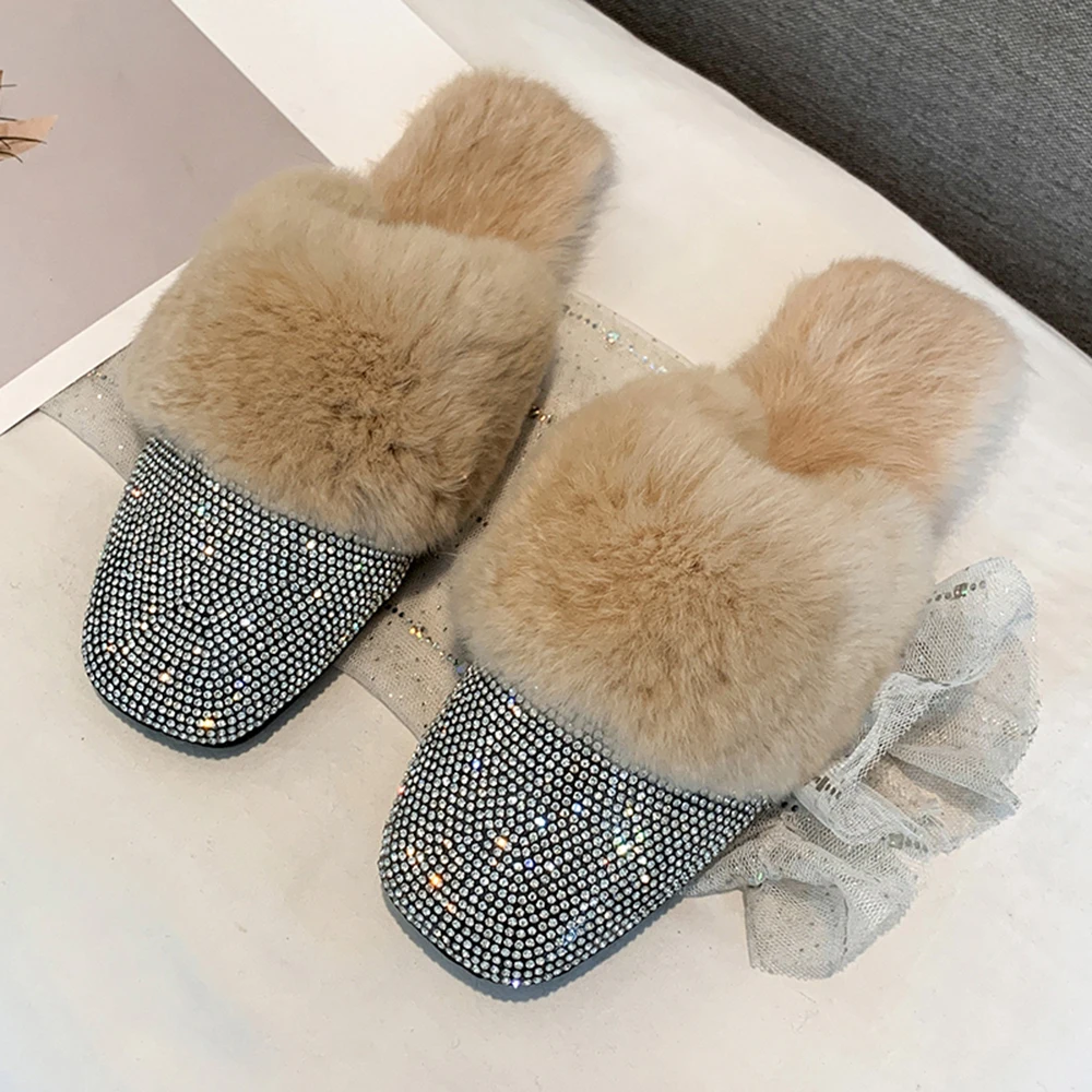 Женские шлепанцы на плоской подошве; пушистый мех; мягкая стелька; Сезон Зима; Теплый Женский красивый горный хрусталь; повседневные шлепанцы для свиданий