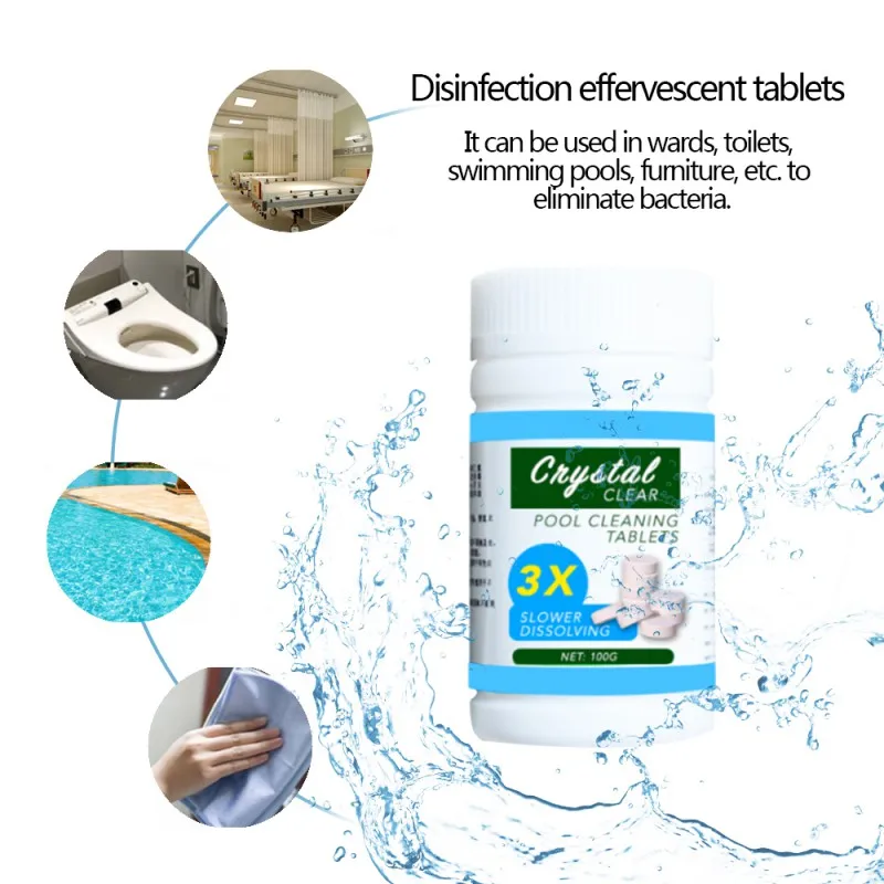 Description: 1.Pool Cleaning Tablets effectively guard against bacteria, algae and other organisms. These swimming pool water sanitizers create a safer,cleaner, and more enjoyable swimming experience. 2.Protect against chlorine loss in direct sunlight while stabilizing them, reduces the amount of chemicals you need to add. Use 7 tablets per 2,500 gallons of water per week to achieve crystal clear pool water! 3.Eliminate bacteria and controls algae in the water 4.Purify water. No more dirty pool 5.Protect against harmful sun rays