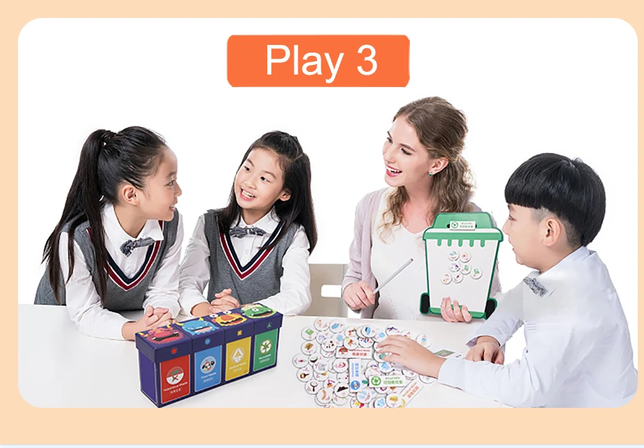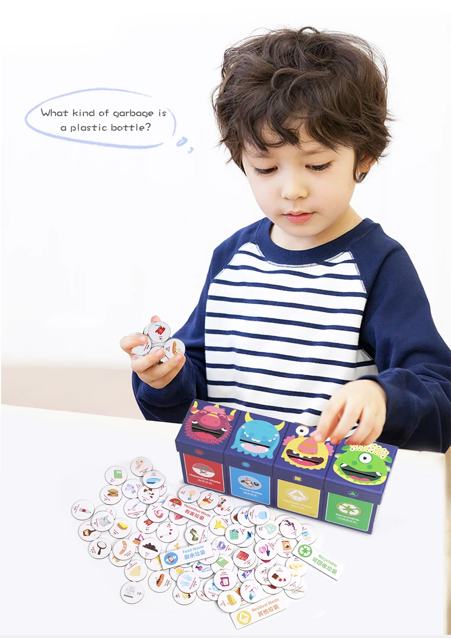 1. Выньте все мусорные магниты на столе, и испортите карту 2. Поместите мусорные магниты в соответствующий мусорный бак 3. Родители могут открыть внутреннюю крышку, чтобы проверить, правильно ли засекречены магниты для мусора.