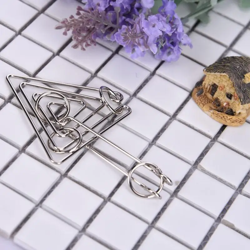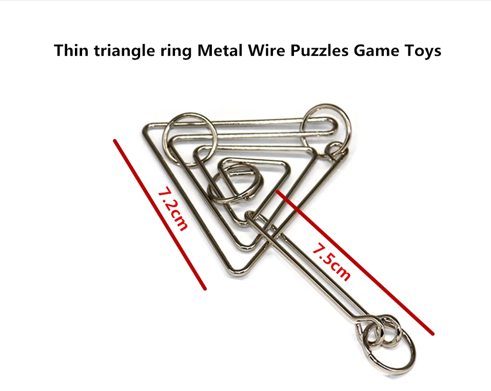 Название: тонкие треугольные кольца из металлической проволоки Пазлы игровые Игрушки Тип товара: Волшебные кубики Материал: Нержавеющая сталь Цвет: серебро Размер: длина треугольника: 7,2 см; длина ручки: 7,5 см Вес: около 20 г Подходящий возраст: 6 +
