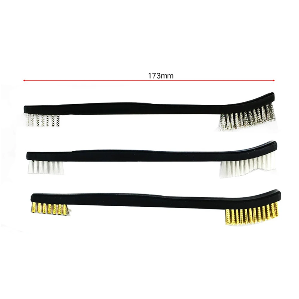 Стальная щетка подходит для краски на металле, ржавчине и коррозии; Латунные щетки подходят для очистки металла, свечей зажигания и аккумулятора; Светильник нейлоновая щетка подходит для очистки пластика и интерьера, украшения для приборной панели автомобиля и вентиляционных отверстий.