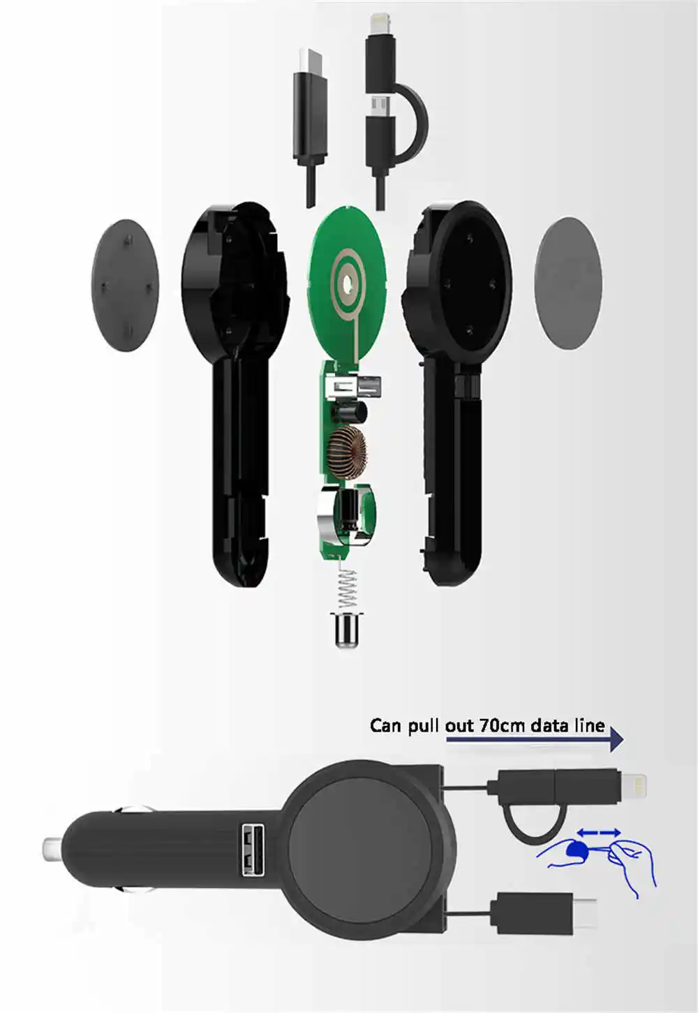 Тип портов: micro + 8pin + type-c Длина кабеля: длина кабеля составляет 1 м, а Регулируемая длина-70 см Спецификация медной проволоки: доступно более 3.1A ток Материал: защитная оболочка из АБС-пластика Сердечник: сердечник из бескислородной меди