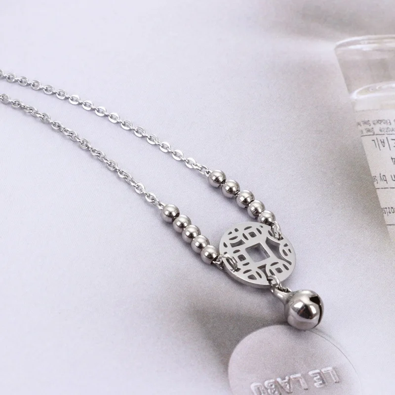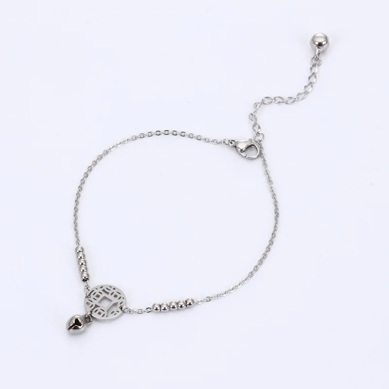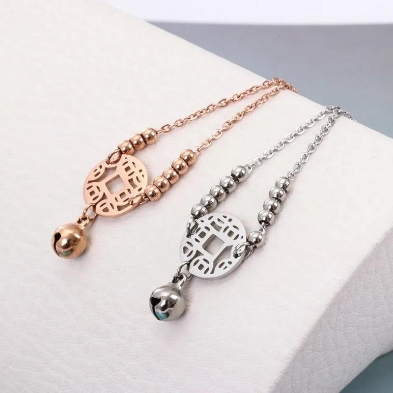 Женский браслет-цепочка из нержавеющей стали 316L, с титановыми полыми китайскими древними монетами и колокольчиками, ювелирные изделия, 2019